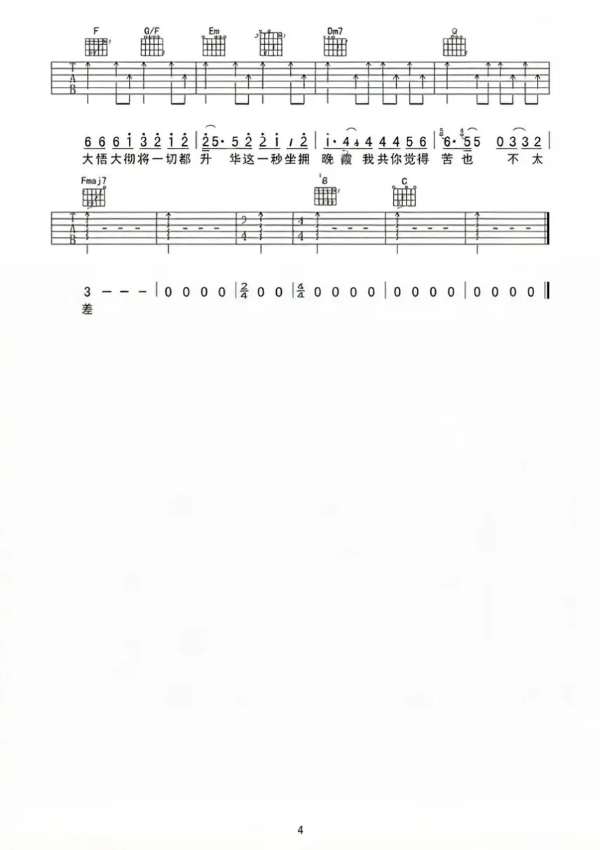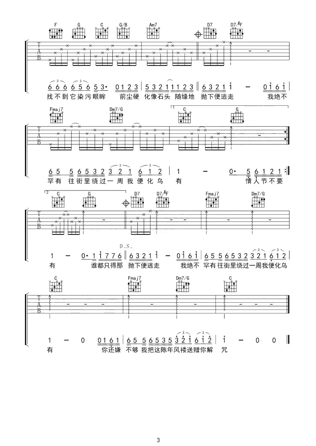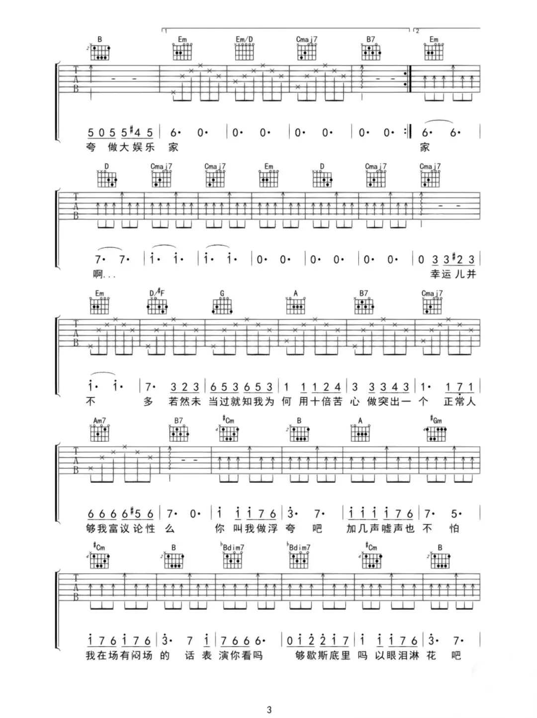 《浮夸》2005年发行,是陈奕迅极具代表性的粤语作品。歌词讲小人物在人群中的压抑与呐喊,道尽被忽视的落寞,副歌的呐喊式演唱充满张力。它的吉他编配层次丰富,主歌用低沉的分解和弦,副歌可以用扫弦增强情绪,适合进阶练习,能锻炼力度控制和情感表达。