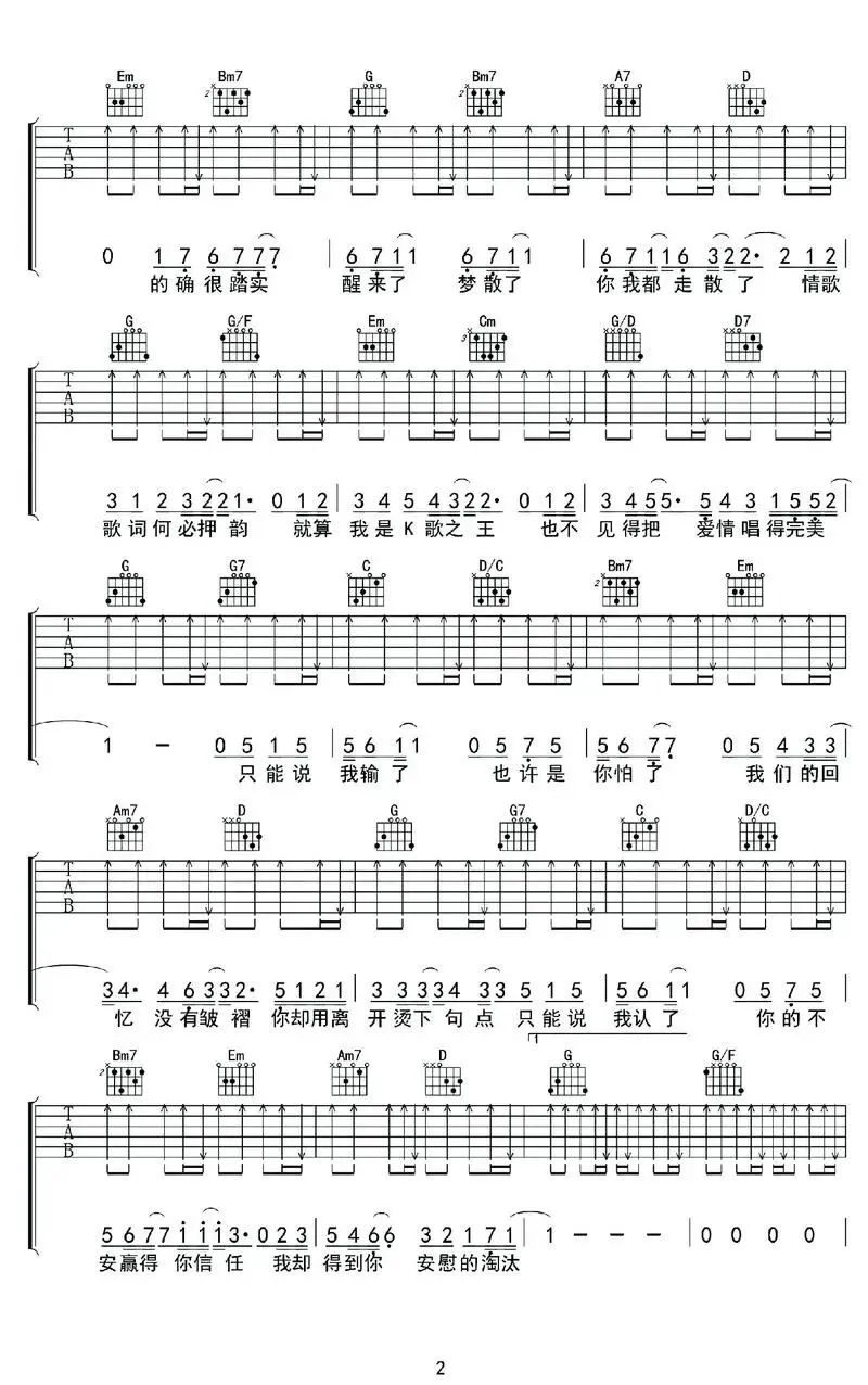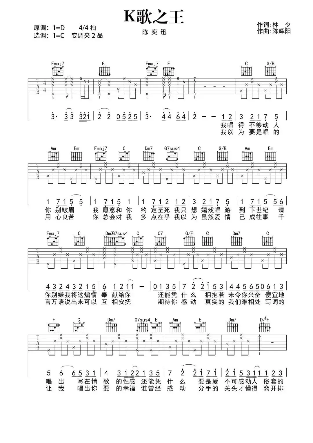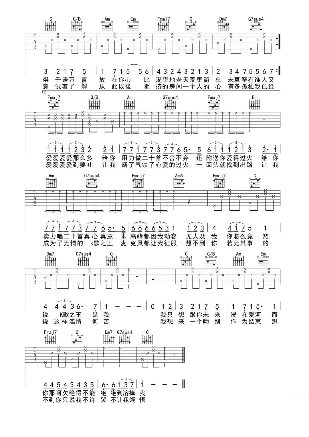 《K歌之王》有粤语和国语两个版本,2000年发行 。林夕的词把KTV文化和爱情卑微感结合,陈奕迅从平静演唱到爆发式演绎,成为一代人的“备胎神曲”。国语版歌词包含65首经典歌曲名字,呼应感很强。吉他弹唱时,主歌用舒缓的节奏,副歌可以加重扫弦力度,还原歌曲的情绪起伏。