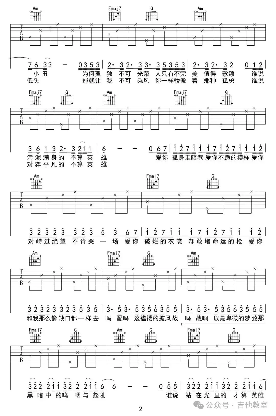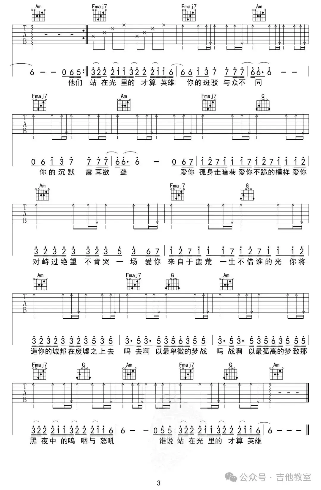 《孤勇者》2021年发行,是《英雄联盟:双城之战》的中文主题曲 。词作者唐恬在抗癌期间创作,把对命运的不屈精神融入歌词,成为普通人对抗苦难的精神图腾。歌词里“谁说站在光里的才算英雄”,致敬每一个逆境中坚守的人。吉他弹唱时,主歌用舒缓的分解和弦,副歌用有力的扫弦,能还原歌曲的热血氛围。