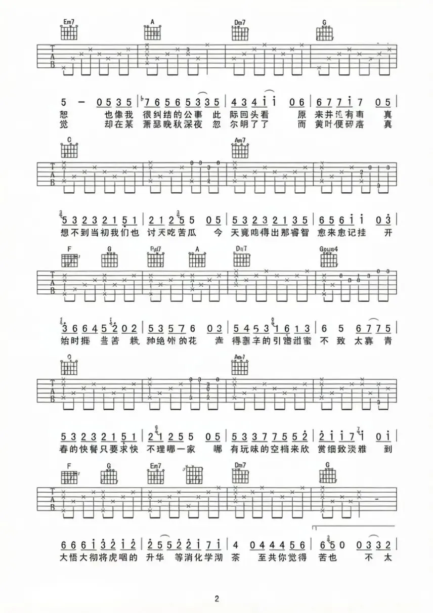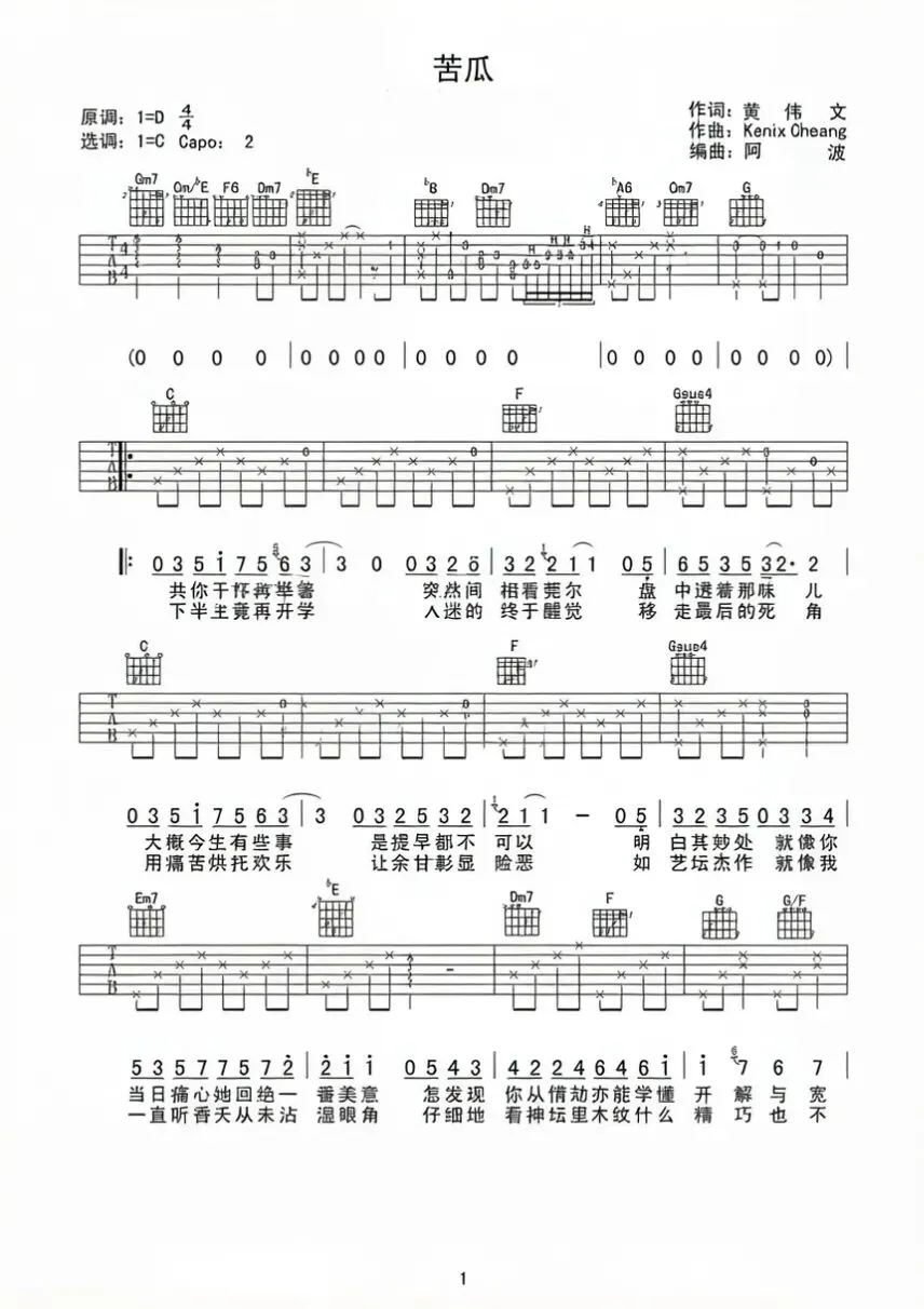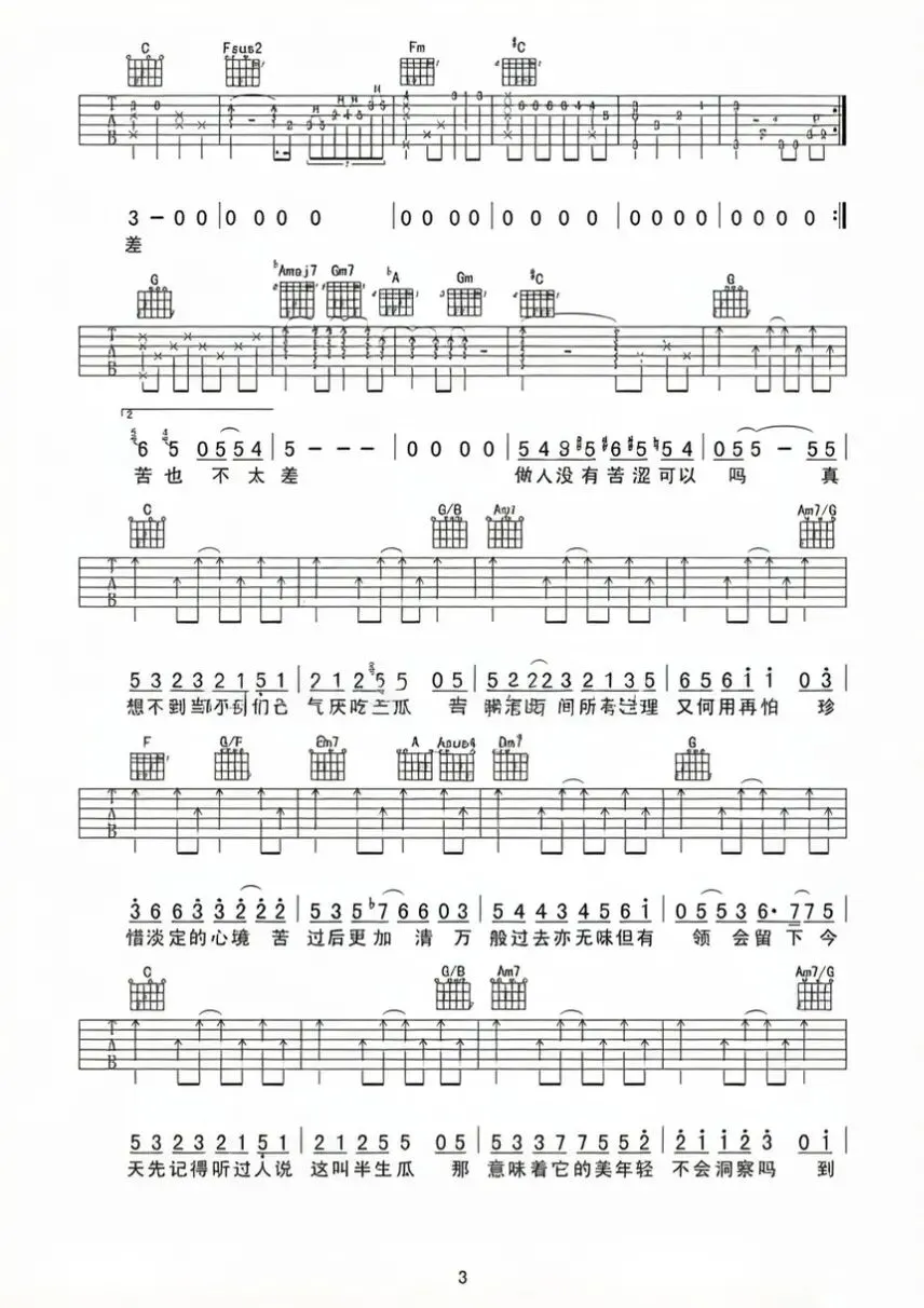 《苦瓜》2011年发行,用苦瓜的成长过程比喻人生经历。歌词写从青涩到成熟的蜕变,“当初的坚持,如今都变成习惯”,传递成长的感悟。吉他编配舒缓,分解和弦温柔,适合练习表达人生哲理的歌曲,弹唱时能慢慢体会歌词里的时光沉淀。
