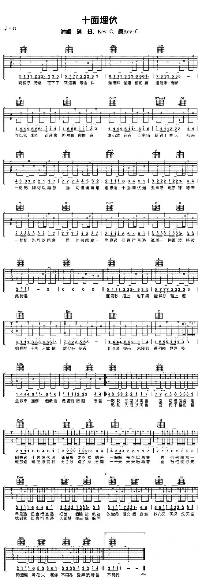 《十面埋伏》2003年发行,写的是爱情里的错过与遗憾。歌词用“埋伏”的比喻,讲想靠近却又退缩的矛盾心理,情感很细腻。吉他编配注重情绪铺垫,主歌用舒缓的节奏,副歌可以适当增强力度,适合练习表达纠结情感的歌曲。