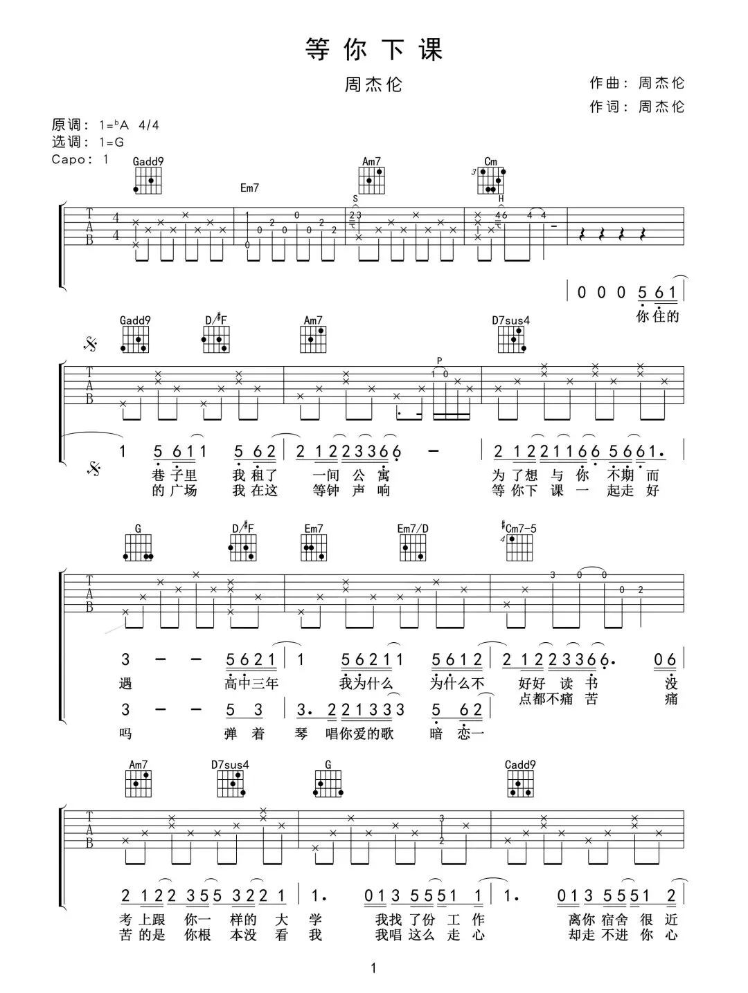 周杰伦《等你下课》吉他谱