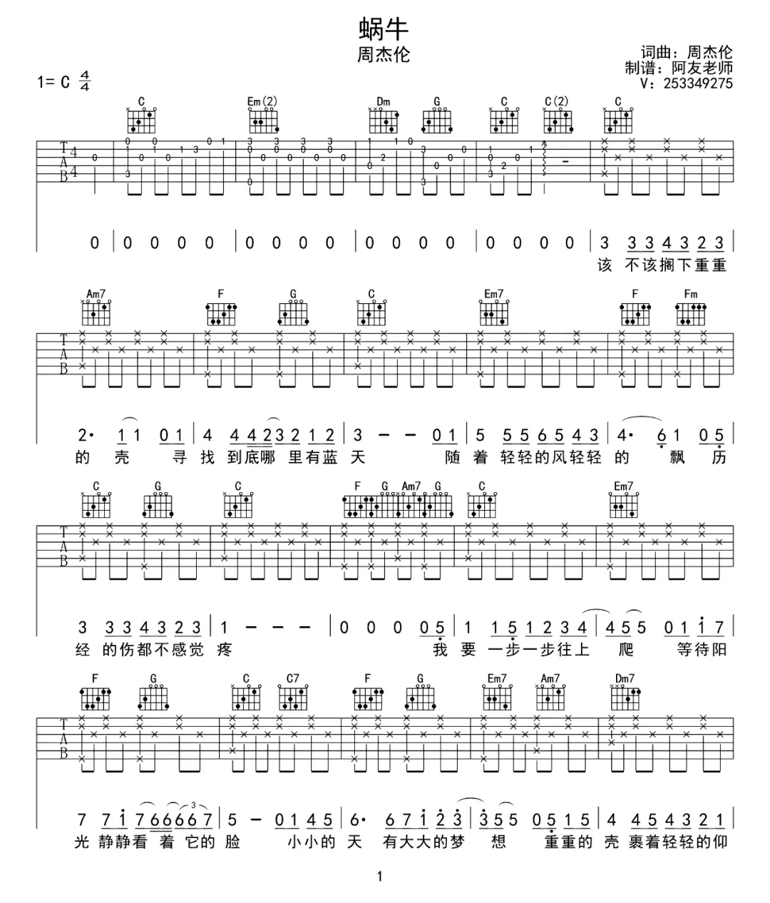 周杰伦《蜗牛》吉他谱