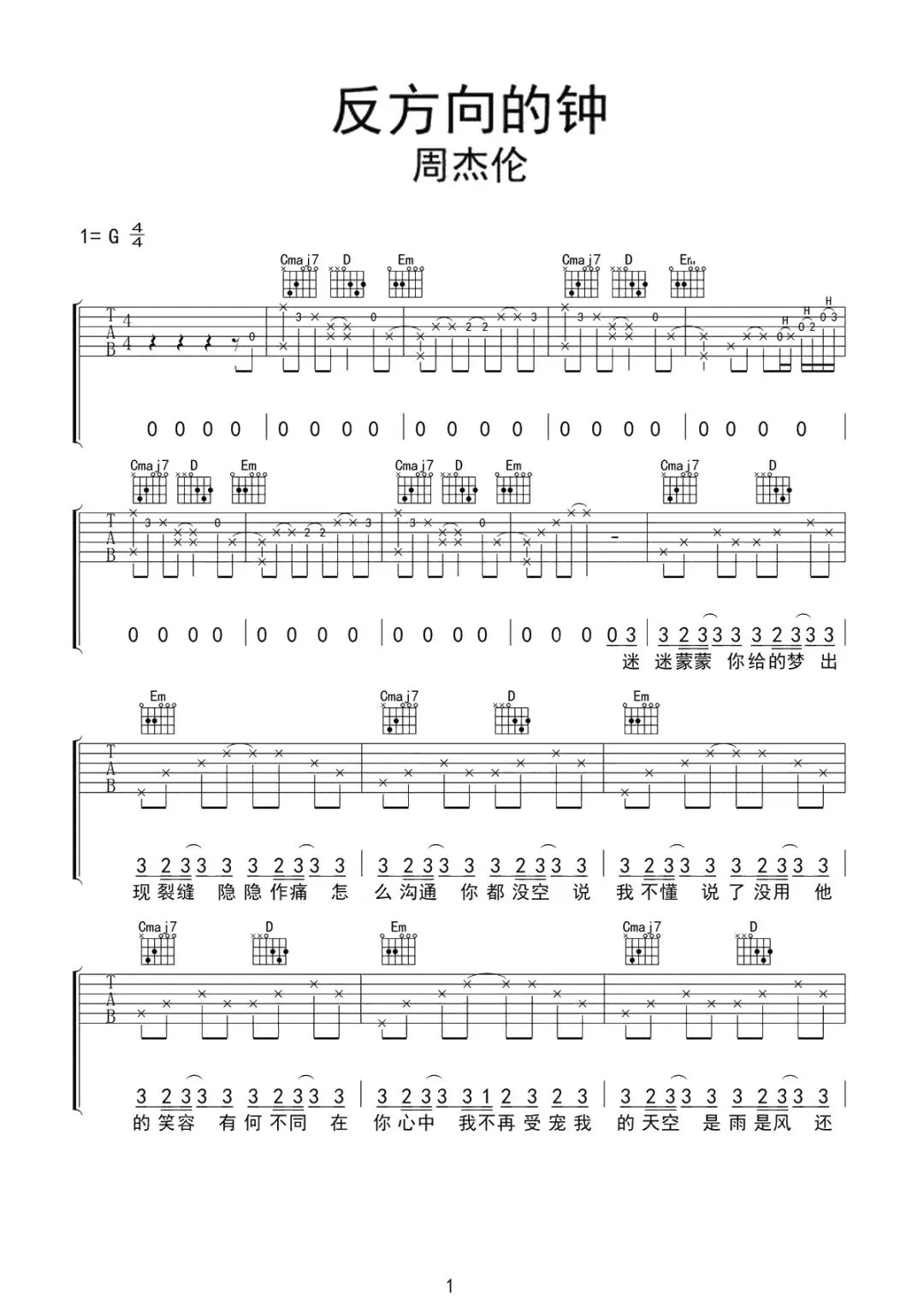 周杰伦《反方向的钟》吉他谱