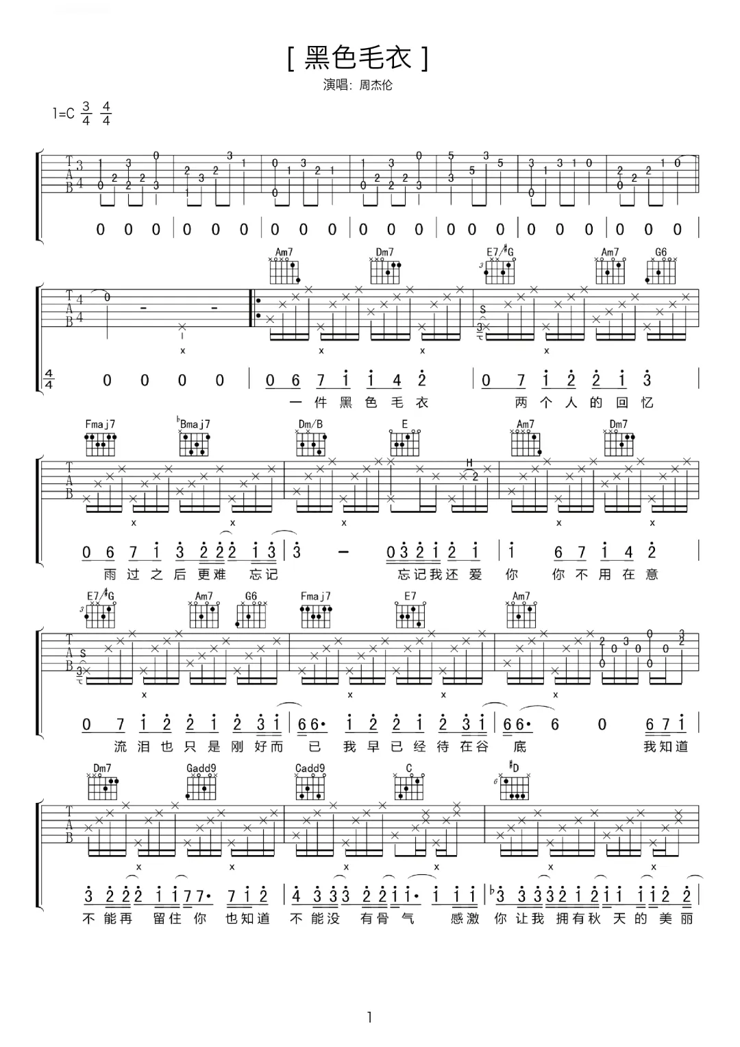周杰伦《黑色毛衣》吉他谱