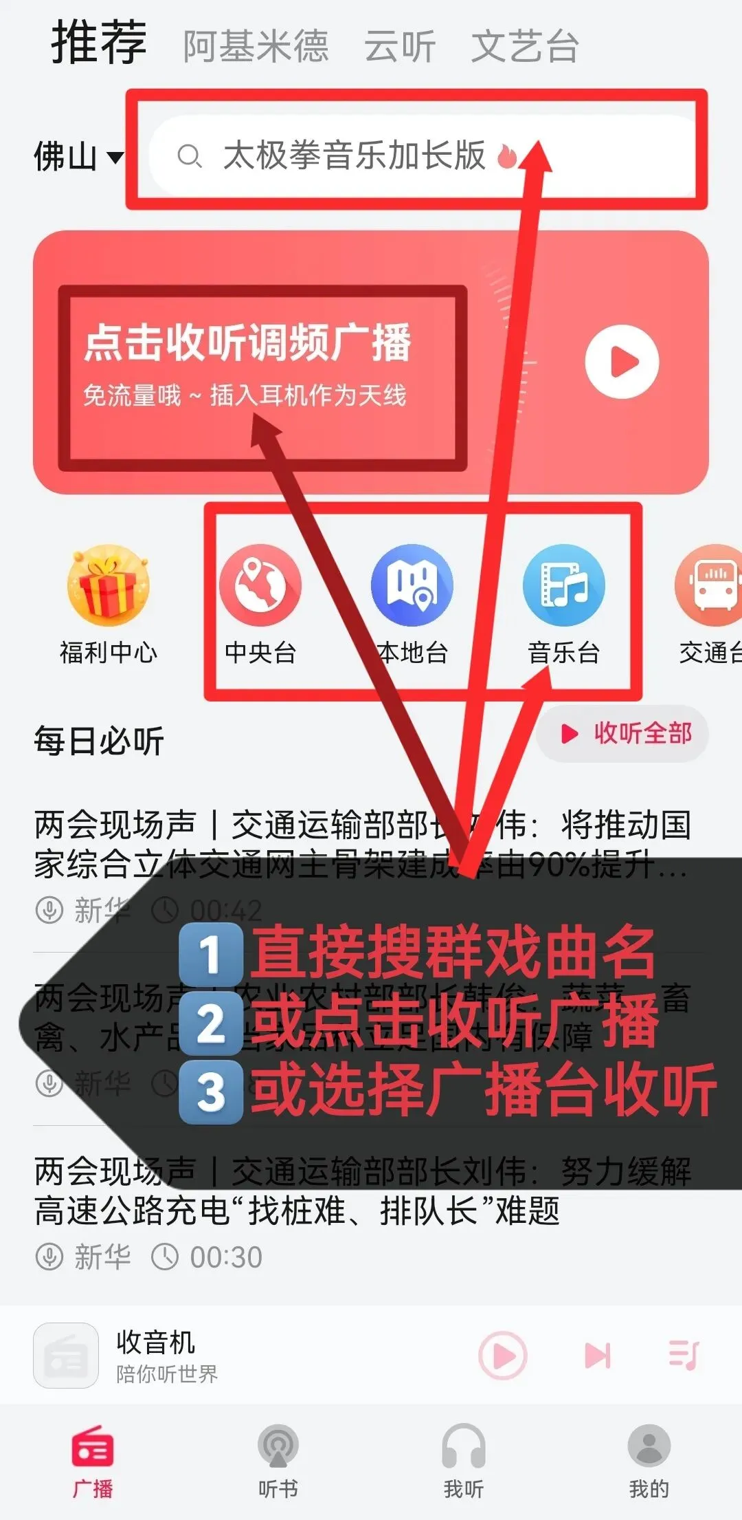 步骤2:直接搜索想听的戏曲/音乐(比如天仙配),也可以【点击收听调频广播】(一个台一个台听),还可以选择【中央台】【地方台】【音乐台】等广播台频道