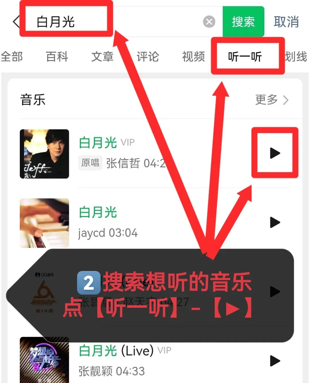 步骤2:在搜索结果中,可以选择【视频】单击播放视频📺,或者选择【听一听】-【▶】播放音乐🎶