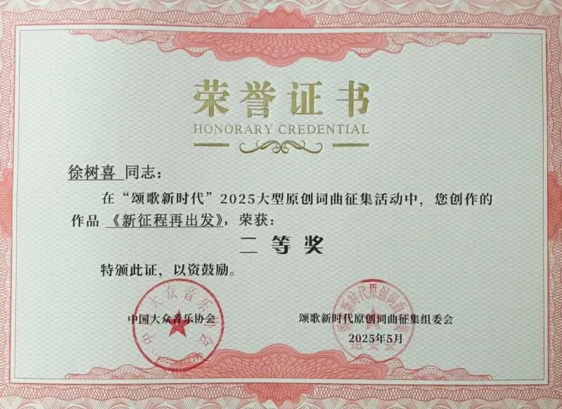 徐树喜同志原创歌曲《新征程再出发》在由中国大众音乐协会主办的“颂歌新时代”2025大型原创词曲征集活动中荣获二等奖;入围由甘肃省总工会、甘肃省文联举办的“庆工运百年·展陇工风采”百首职工原创歌曲征集展播活动。
