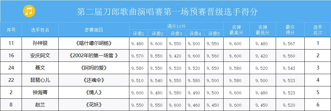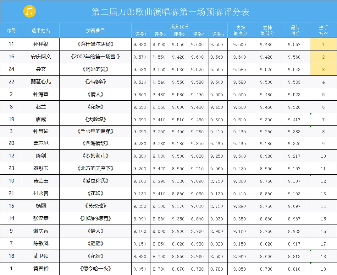 19组参赛选手成绩出炉