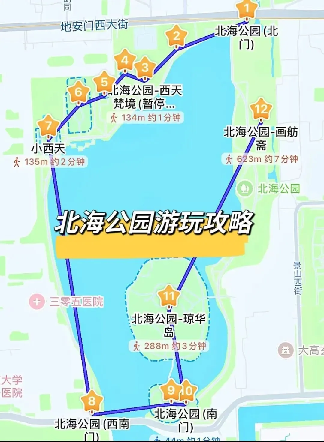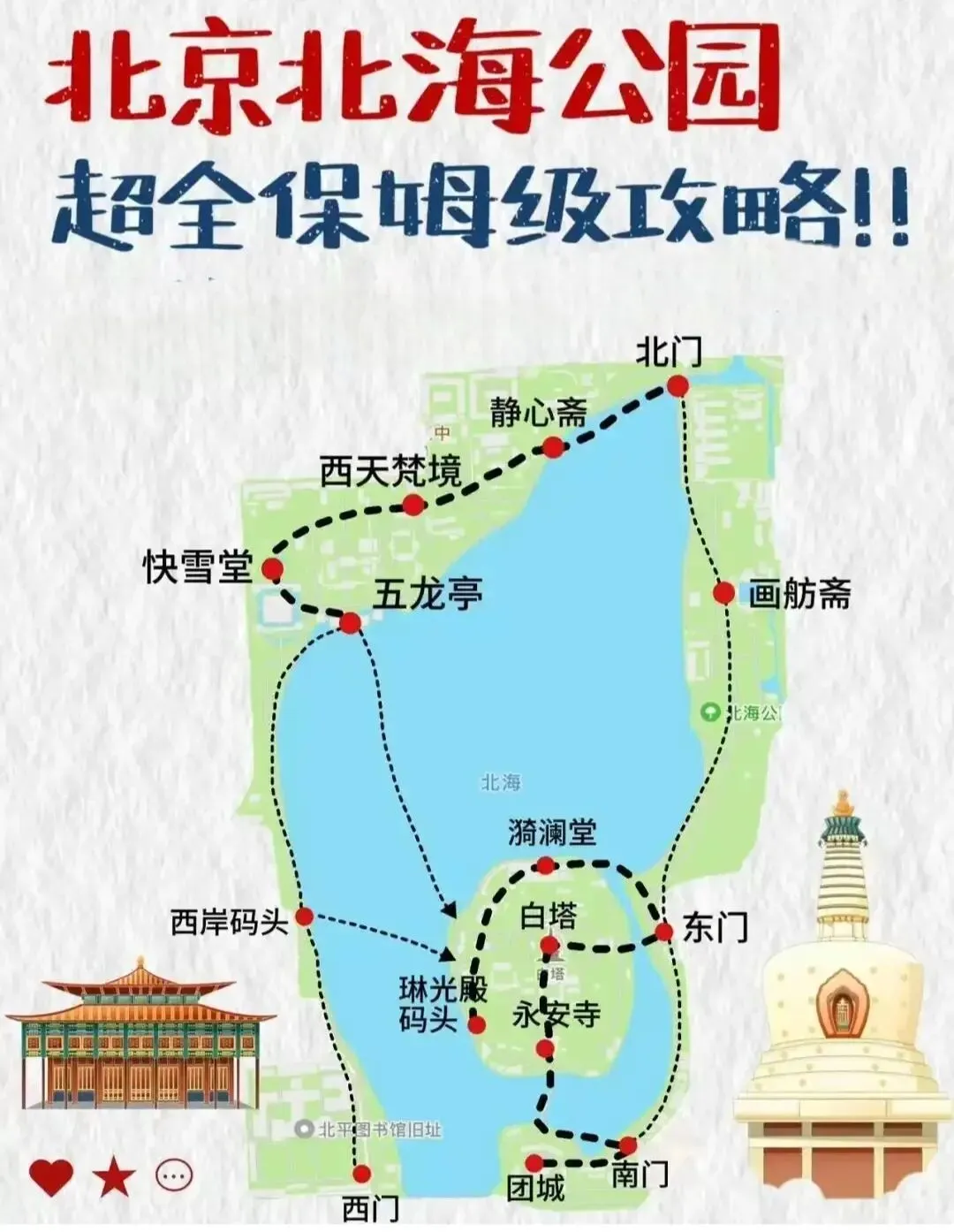 * 路线:南门进 → 琼华岛(登白塔)→ 环湖长廊 → 湖边码头 → 五龙亭 → 九龙壁 → 小西天 → 西门出