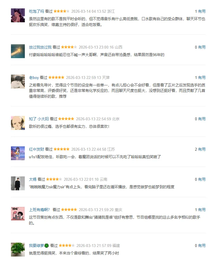 特别能挑事儿和找事儿的豆瓣用户们,竟然也对《魔力歌先生》给出了近乎清一色的好评。至此,我感觉,我对这档音乐综艺的“初看法”是较为大众化的了——它就是一档把音乐大魔王们以喜剧的方式聚集起来之后干音乐正事儿的节目,就是通过唱功来打动听众的了。而这样的又有唱功又有喜剧包袱的音乐综艺节目,应该能火吧?