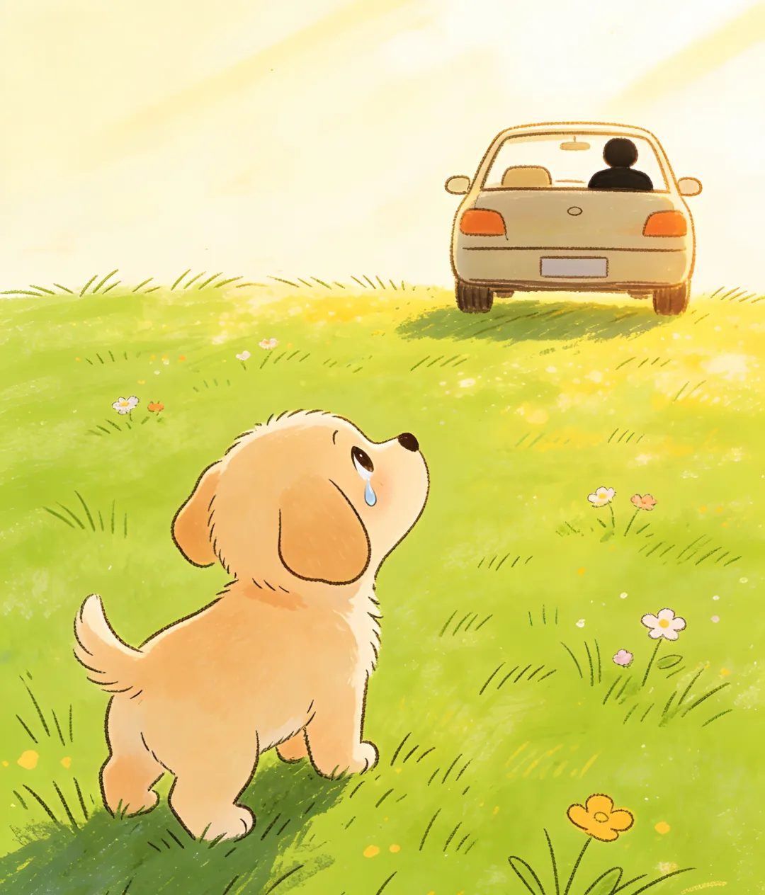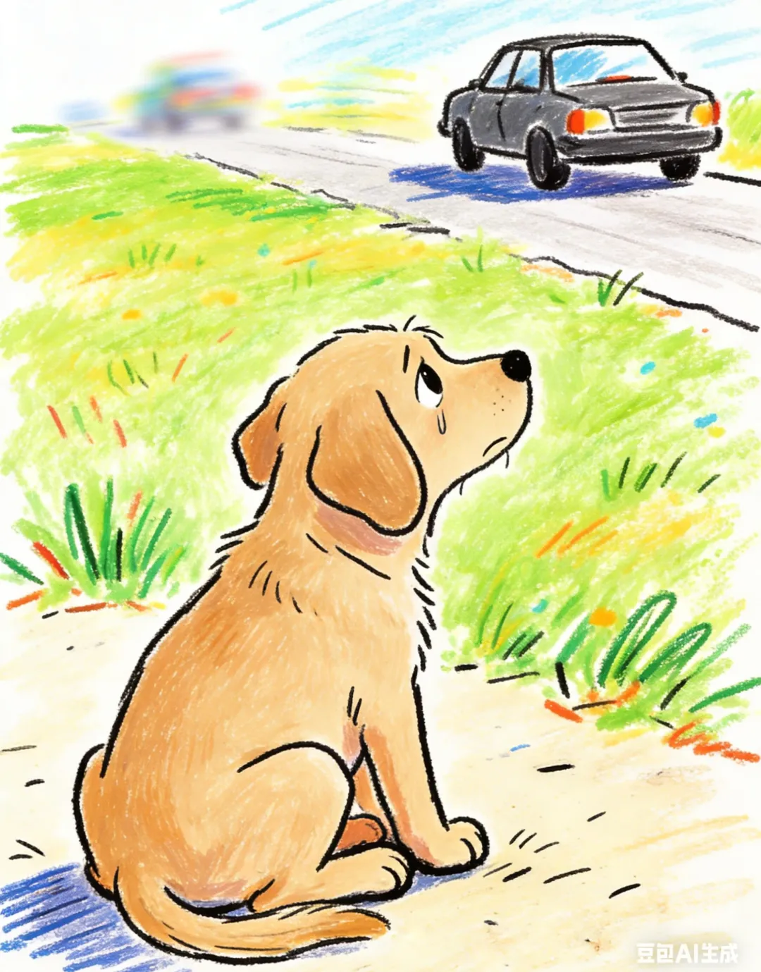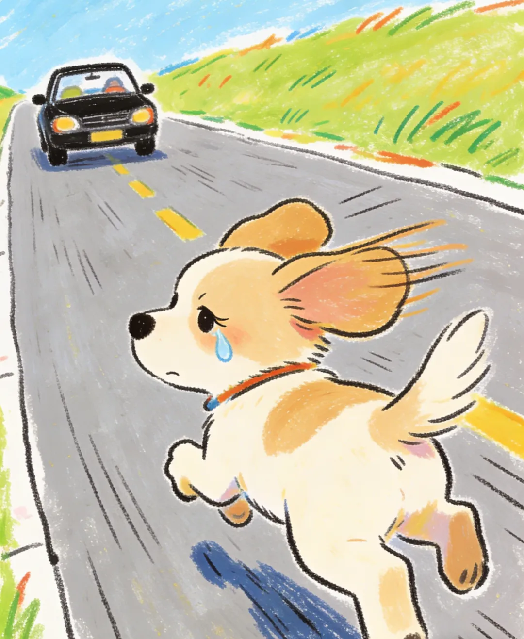 我停了下来,眼泪汪汪的,路是这么冰冷,可我的腿都快断了,我要停下来吗?不!我一定要追上!我继续奋力追着车子,我的耳朵飞了起来,四条腿也绞在了一起,可我不能放弃,我不能没有家!我一边跑,眼泪就一边往下流,道路被我的眼泪浸湿,车子也消失了,我不知道要不要继续追赶,可我又有什么办法去找到主人的车子呢?
