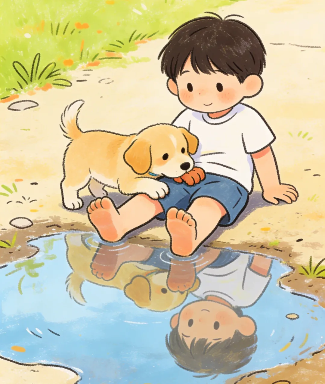 这会是我的主人吗?他会收养我吗?许多问号冒了出来,我轻轻地把头和脚放到他的身体上,他害怕了,把手缩了上来,我轻声叫了两声:“汪,汪。”证明我是温顺的。在这几秒钟内,时间好像静止了,一个个水洼映着我们的身影。我相信,他肯定在想要不要把我带回去。