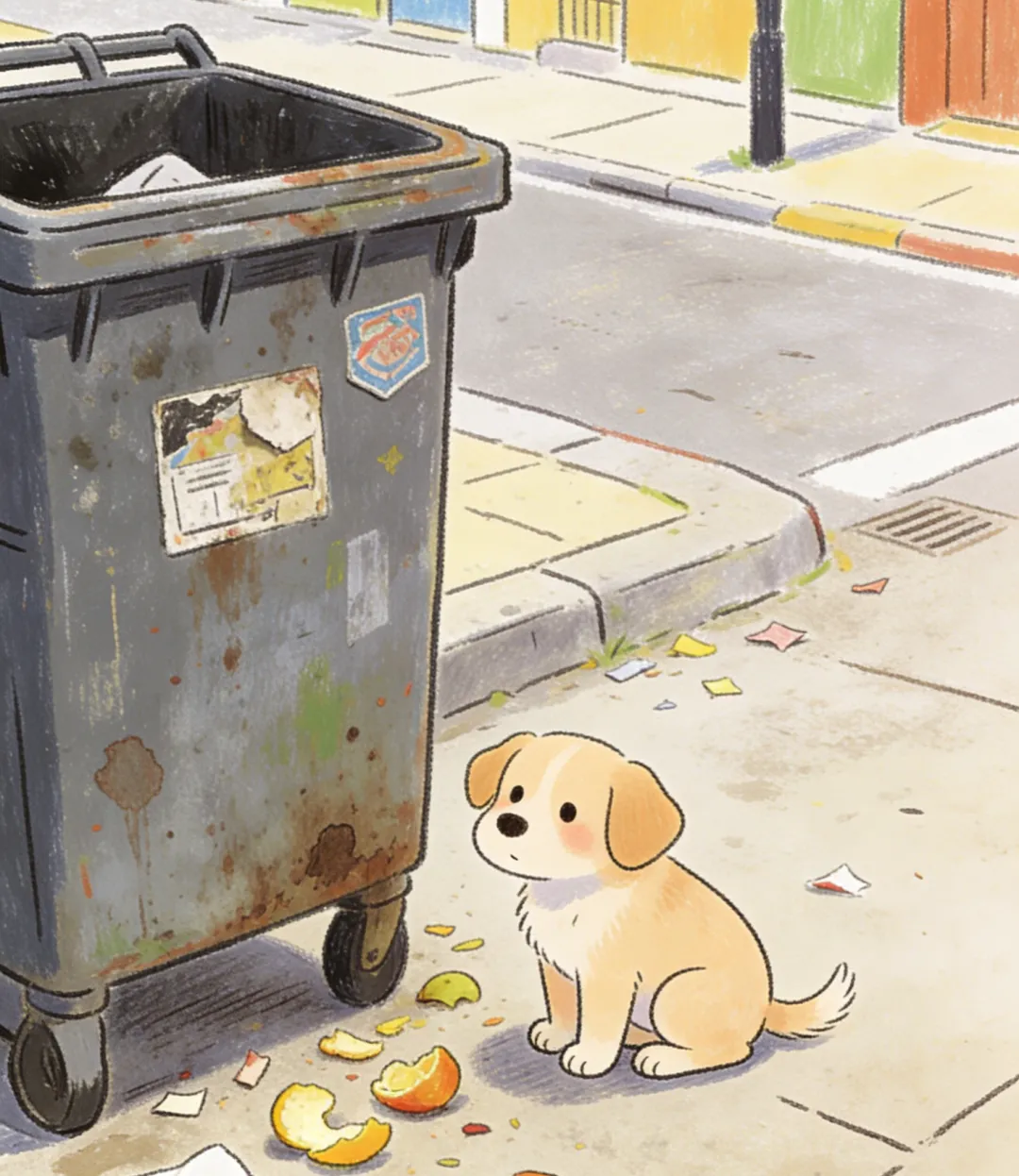 我跑进了城市,迈开步子,在一个堆满垃圾的垃圾桶旁寻找食物。我发现了一个小盒子,里面装着发酸的鸡翅。咕咕,咕咕,我肚子太饿了,可鸡翅酸酸的,黏糊糊的,吃着吃着,我不禁想起温暖的家里,姐姐温柔地摸我的头,我吃的都是可口的牛肉、鸡胸肉和肉末蛋炒饭……