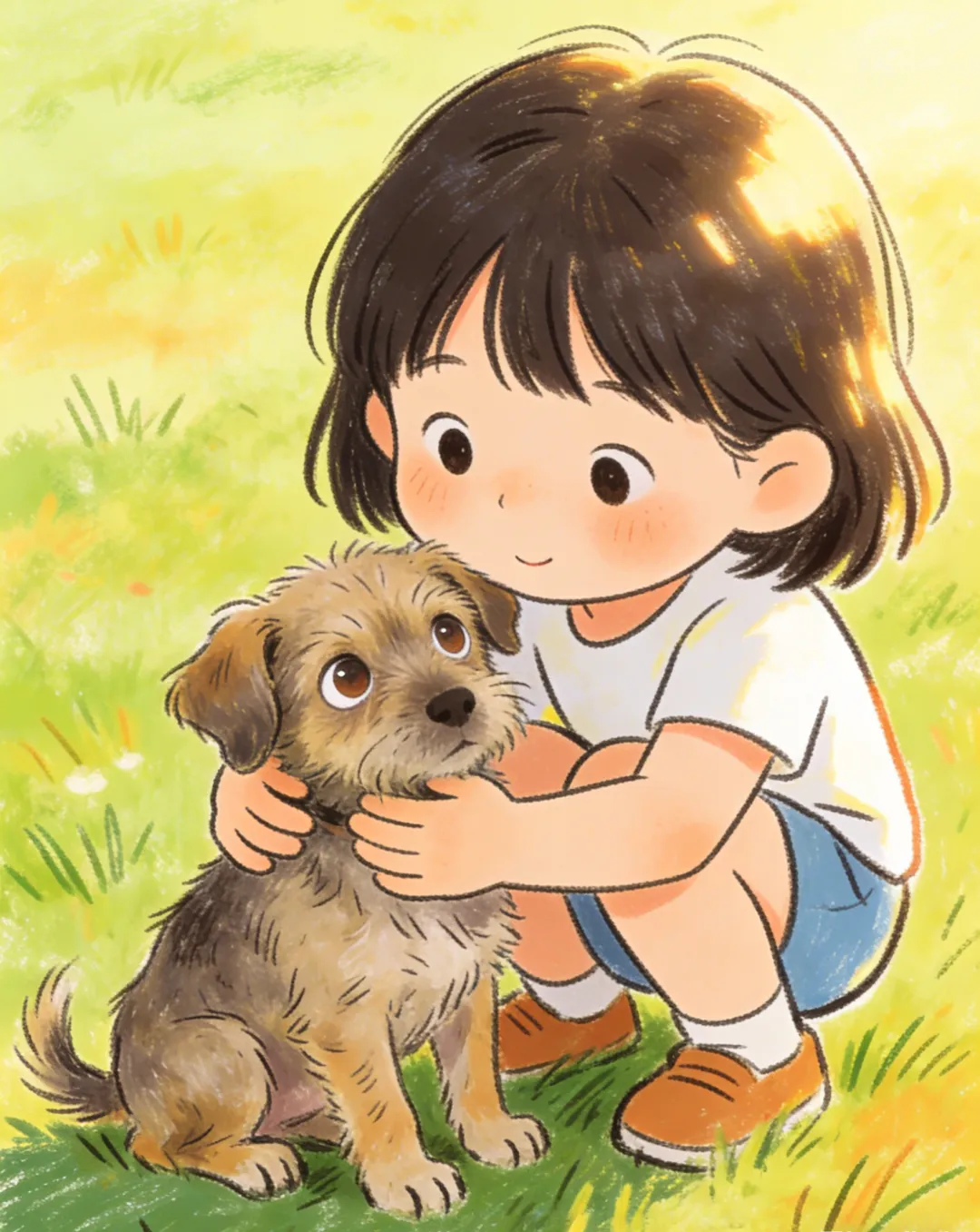 第二天天亮了,那只被人丢下的流浪狗在村子里走了一圈又一圈,忽然它看见一个孩子站在远方看着它,它以为她是自己的姐姐,就飞快地用力地跑,然后趴到那孩子的腿上,用力地闻了闻。咦,这不是我的姐姐呀?但那孩子却把它抱起来说:“你好可爱呀!你以后可以做我的宠物吗?”它没多想就“汪”地答应了。真没想到这孩子给它带来了不一样的生活!