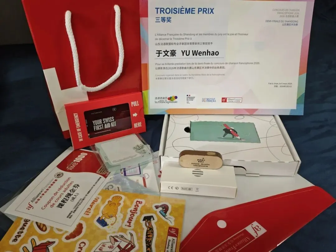 近日,由法语联盟举办的2026年法语歌曲大赛山东赛区半决赛圆满落幕。我院法语专业同学于文豪凭借扎实的法语发音、出色的演唱实力和细腻的情感表达,从全省众多选手中脱颖而出,荣获三等奖的优异成绩!