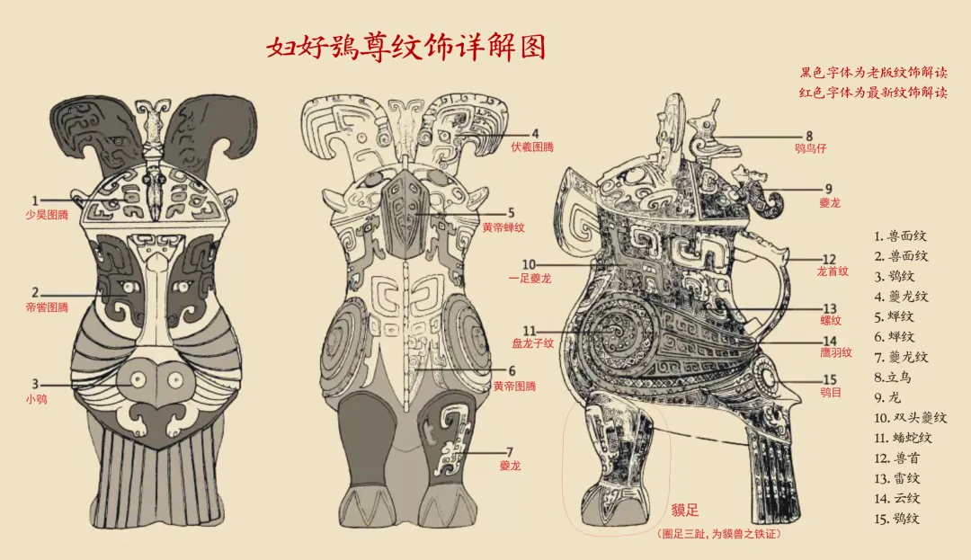 纹饰体系上,武丁时期祭祀礼器以饕餮纹为主流,辅以少量其他纹饰为装饰;而妇好鴞尊以凤鸟纹为核心主纹饰,同时搭配十多种其他纹饰,在同期祭祀礼器中极为罕见(《商周青铜器纹饰》上海博物馆编;朱凤瀚《中国青铜器综论》)。