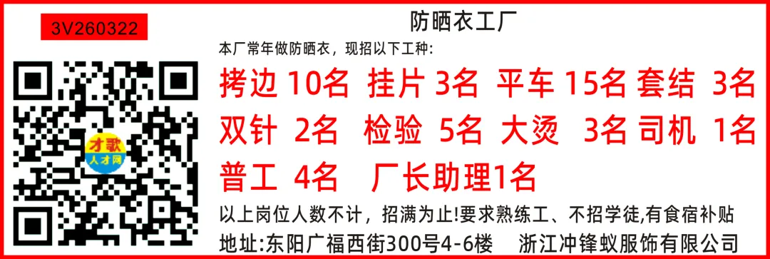 防晒衣【拷边工】2名 平车开袋上拉链:5名