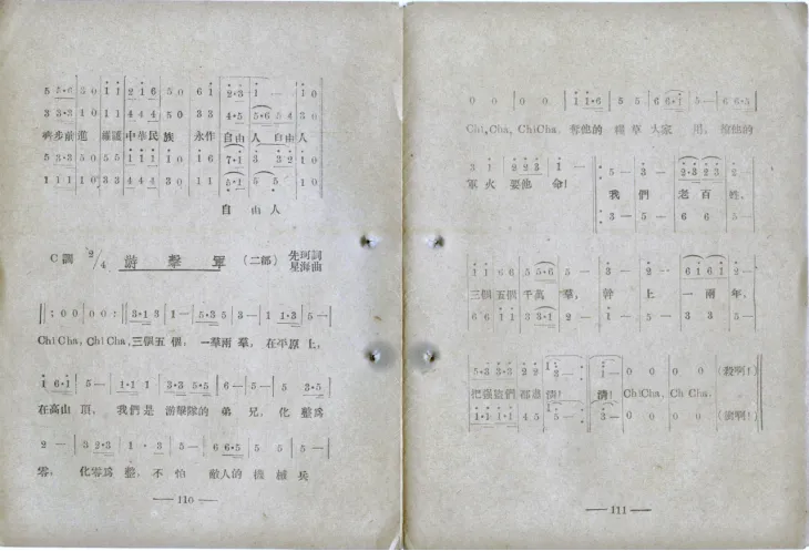 《游击军》节奏鲜明,旋律优美,特别是后段“夺他的粮草大家用,抢他的军火药他的命” 具有民歌风,是一首充满乐观精神的进行曲。我们试唱了几遍,提不出修改意见,全曲按原稿“通过”。最后星海用笔注上C调。