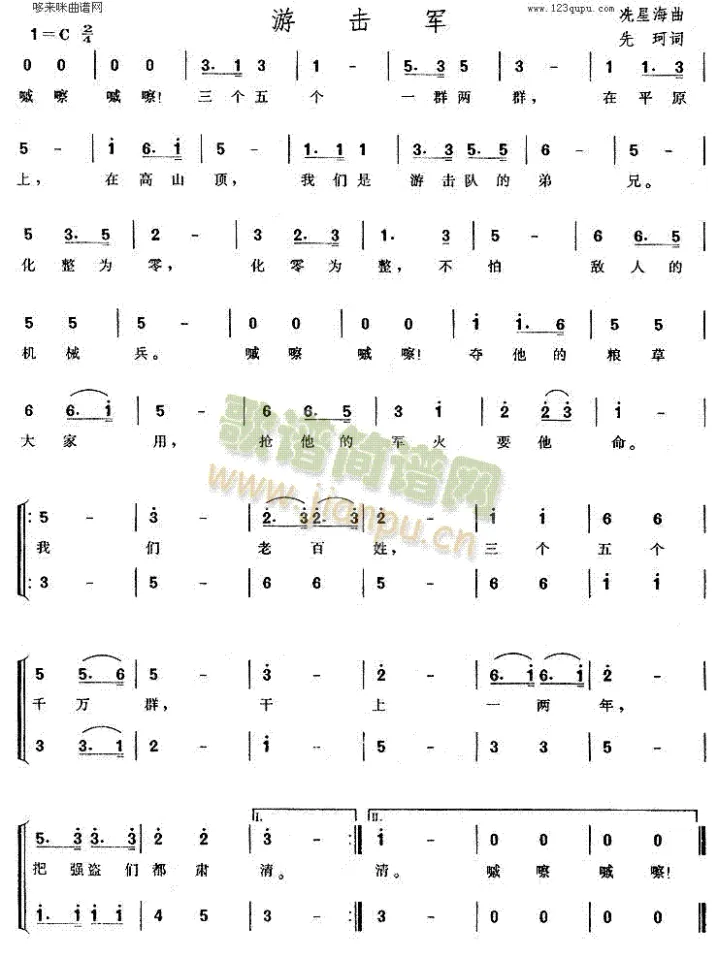 又过了几天,他拿着这歌谱到了武大,这时,曲谱又加以二部已变成二部合唱了。我们把这个歌谱抄在黑板上,他就开始教唱了。他是把这支歌当作进行曲来教唱的,歌的开头用“嘁嚓”这些象声词来象征游击队在日夜行军,并且由远而近,当歌曲到“夺他的粮草大家用,抢他的军火要他命”时,全曲进入高潮,到“我们老百姓,三个五个千万群”时,又由近及远,象是抗日游击队走向远方,深入敌后去了。
