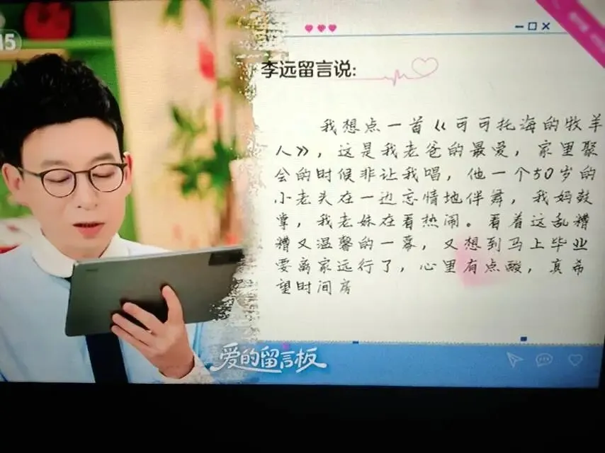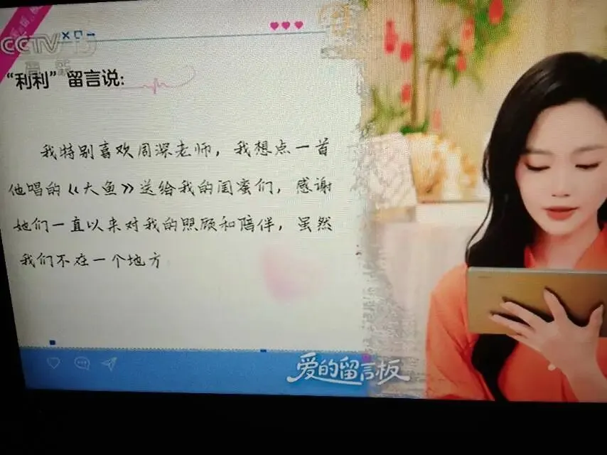 在《爱的留言板》里,尚雯婕演唱《To be free》,来自甘肃天水的李远和央视频多位好友留言点播《可可托海的牧羊人》(王琪),遇见漠小曼,遇见更美的自己!来自重庆的网友“利利”等留言点播周深演唱的《大鱼》,吉克隽逸演唱《身骑白马》,……