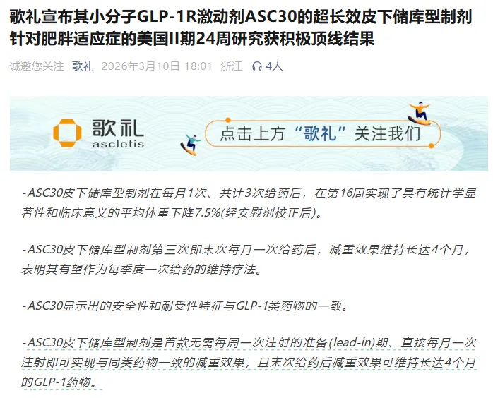ASC30皮下储库型制剂A1的给药方案:所有受试者接受三次皮下给药,给药间隔为四周,分别在第1天、第29天(第4周)和第57天(第8周)给药,每次剂量为400毫克。ASC30皮下储库型制剂A1在第4周、第8周、第12周和第16周分别实现了2.7%、5.5%、6.3%和7.5%的经安慰剂校正后的平均体重下降。这些数据显示,ASC30皮下储库型制剂A1可每月一次给药用于肥胖症治疗,并有望实现每两个月一次给药,且无需每周一次给药的准备期。