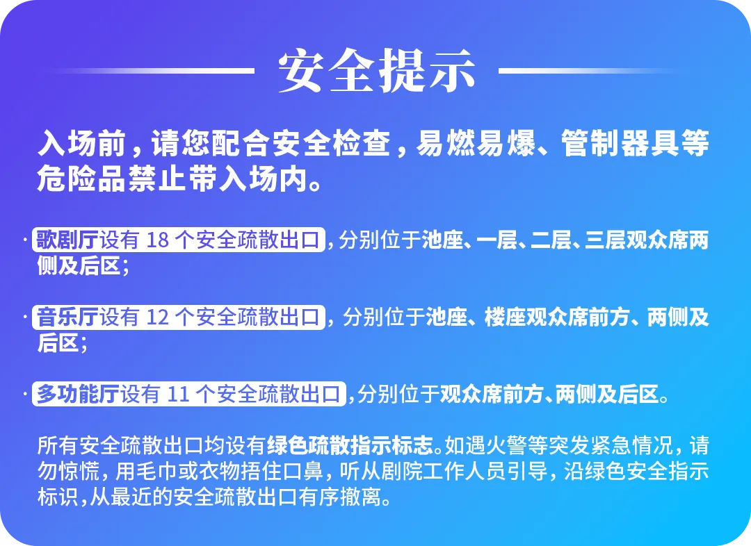 4、歌剧厅一层、二层、三层第一排坐席前方设有安全护栏,歌剧厅一层两侧坐席侧向舞台,存在影响观演体验的可能;歌剧厅二层、三层属于远端坐席,且歌剧厅舞台景深较深,存在无法看到舞台后区舞美及表演的可能。如您购买上述区域座位,可能存在部分位置视线不同程度受遮挡的问题,请谨慎考虑。