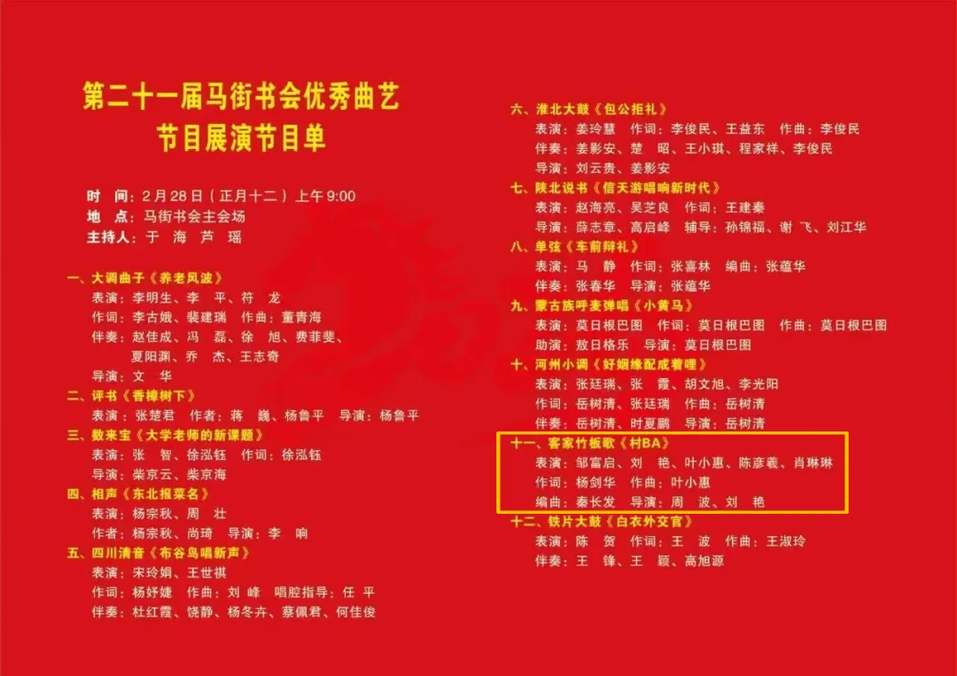 节目单经广西曲艺家协会遴选报送、中国曲协组织专家严格评审,贺州客家竹板歌《村BA》在全国众多报送节目中脱颖而出,成功获得这场全国性曲艺盛会的“入场券”。