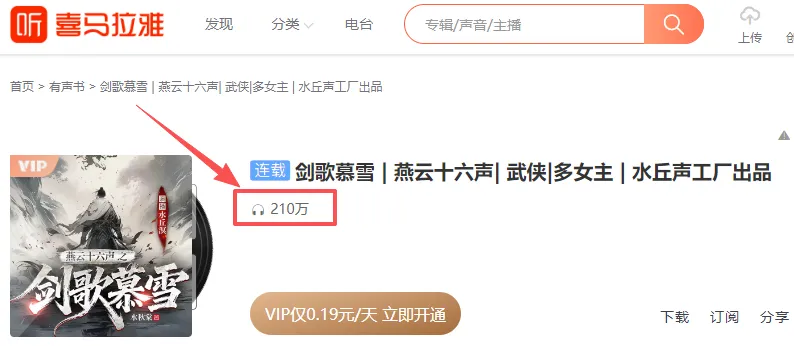 •有声书方面,此次突破200万播放量的佳绩,标志着作品成功跨越了从文字到声音的媒介界限。专业的演播为角色注入灵魂,让听众在通勤、休憩时,随时随地沉浸于刀光剑影与儿女情长之中,实现了作品传播力与影响力的指数级放大。