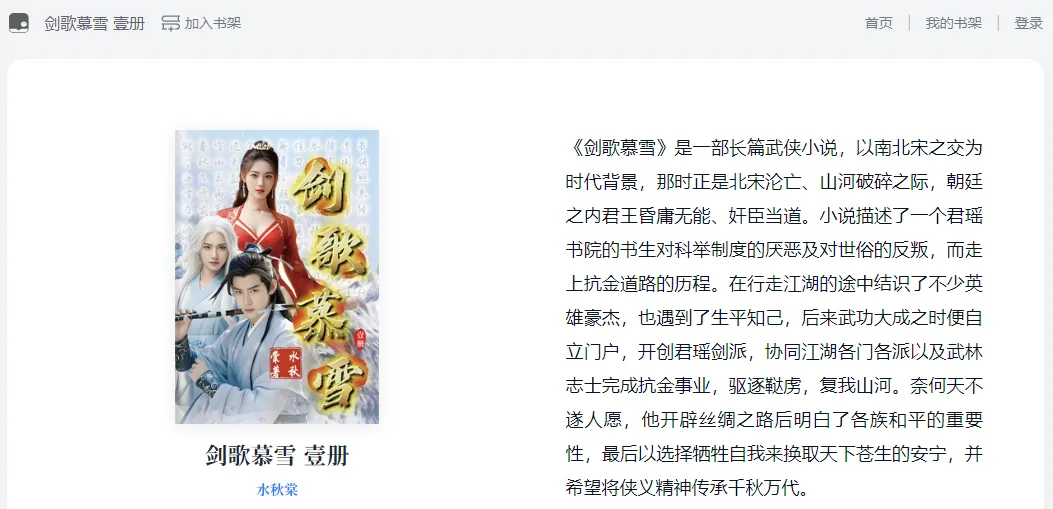 《剑歌慕雪》原著架构恢弘、人物群像鲜明、情节跌宕起伏,篇幅长达200万字。讲述了君瑶书院书生因厌恶科举、反抗世俗而毅然踏上抗金之路的江湖历程。行走四方间,他结识英雄知己,后开宗立派,联合武林各派共御外侮。直至开辟丝绸之路后,他逐渐领悟各族和平共存的真谛,最终为天下苍生安宁而慨然献身……
