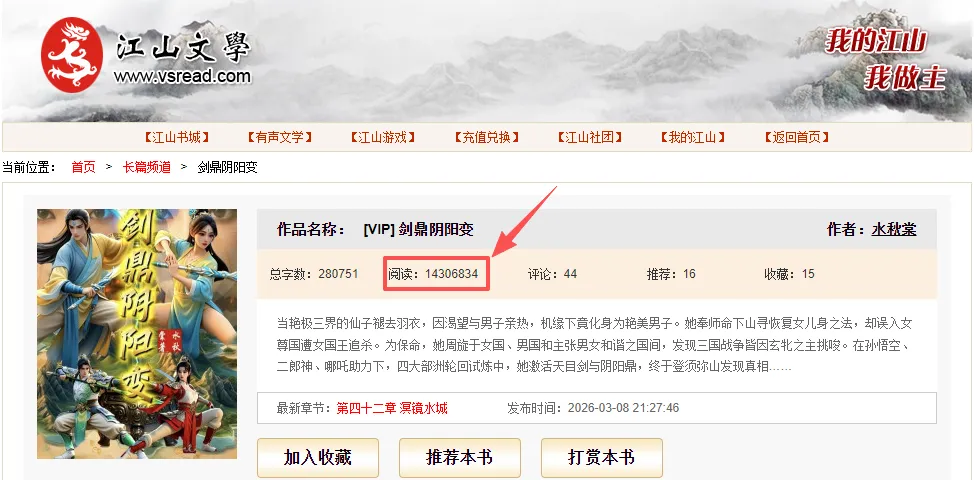 •新作接力方面,其新作《剑鼎阴阳变》在江山文学网阅读量突破千万并登顶VIP榜首,更证明了作者持续的创造力与市场号召力,其构筑的“水秋棠武侠宇宙”正吸引着越来越多的读者。