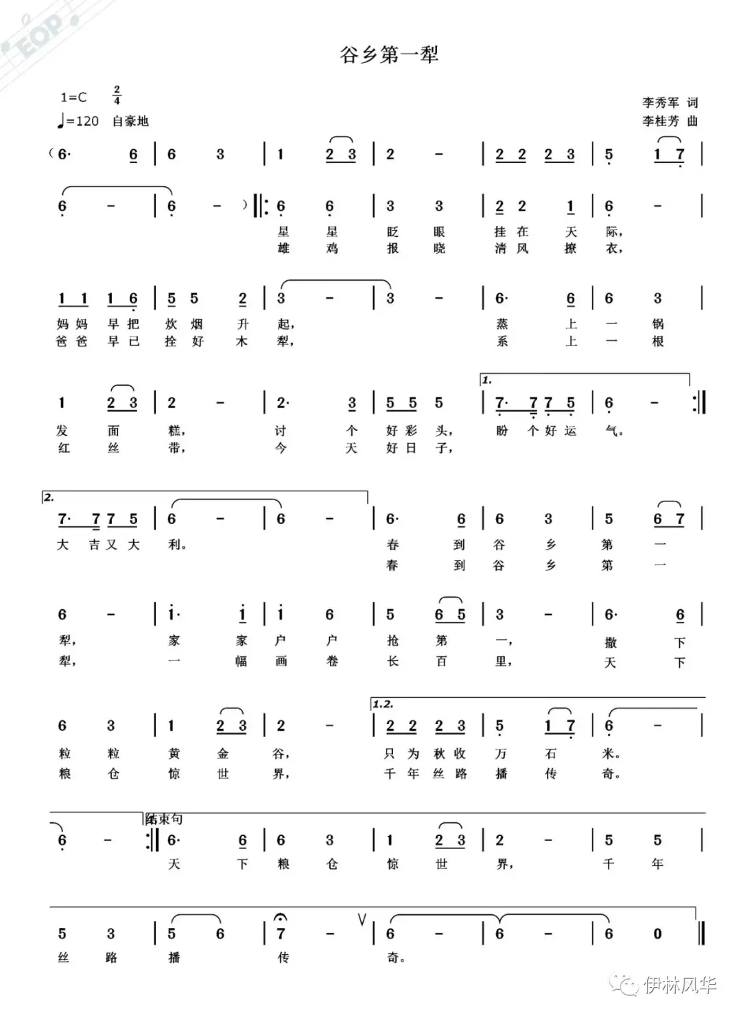 星星眨眼挂在天际,妈妈早把炊烟升起,蒸上一锅发面糕,讨个好彩头盼个好运气。雄鸡报晓清风撩衣,爸爸早已拴好木犁。系上一根红丝带,今天好日子大吉又大利。春到谷乡第一犁,家家户户抢第一。撒下粒粒黄金谷,