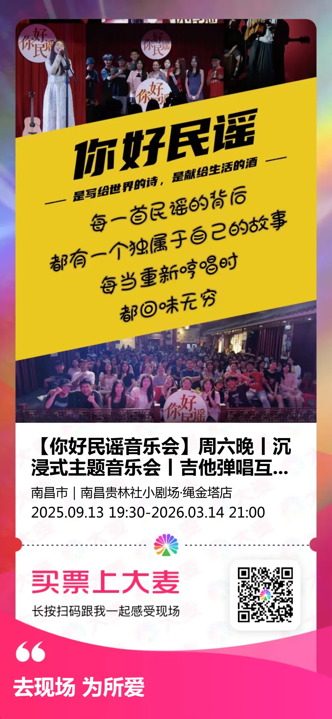 【你好民谣音乐会】,一场属于这座城市的音乐告白。我们用最质朴的旋律,最真诚的词句,唱出南昌的故事:八一桥下的车流,万寿宫旁的热闹,孺子路的夜宵摊,还有那些散落在城市角落的悲欢离合。这里没有华丽的包装,只有扎根于泥土的声音。民谣是城市的日记,而南昌,终于有了自己的篇章。