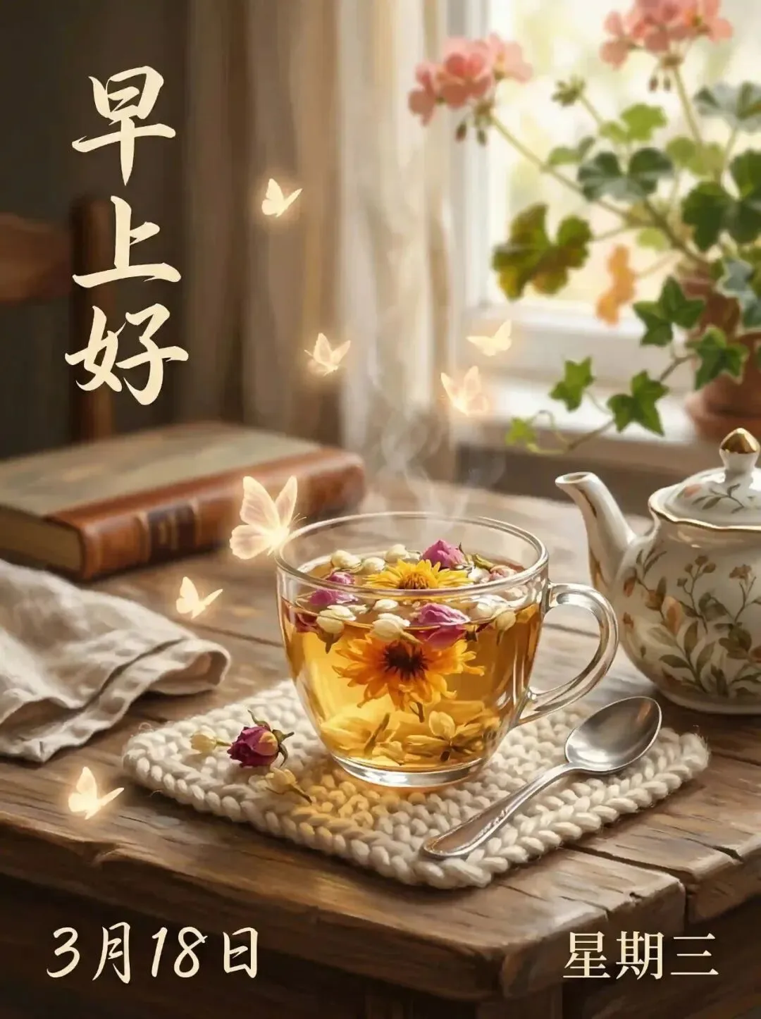 清明透亮这天色,好一个清晨好时刻。不求大富与大贵,只愿平安是此生。把最好的福气送给您,祝您早上好!🍵