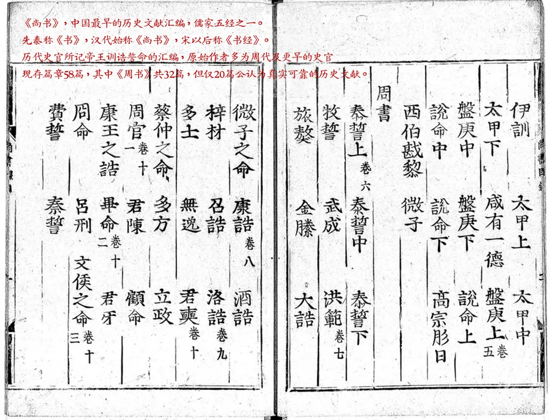 《尚书》,中国最早的历史文献汇编,儒家五经之一。先秦称《书》,汉代始称《尚书》,宋以后称《书经》。历代史官所记帝王训诰誓命的汇编,原始作者多为周代及更早的史官。现存篇章58篇,其中《周书》共32篇,但仅20篇公认为真实可靠的历史文献。殷纣王帝辛
