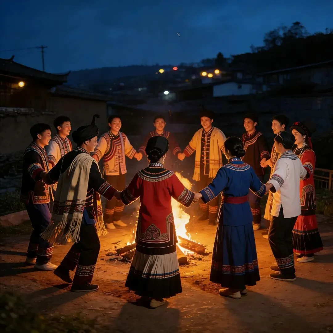 终于,弦子响了,笛、笙声起了。篝火燃起来,映红一张张朴拙欢喜的脸。男女老少,手牵着手,围作一圈,踏地为节,应声而舞。脚步起落,震得尘土轻扬;歌声婉转,绕着山林回荡。没有精致的舞台,青山作幕,晚风为客;没有刻意的编排,随心而唱,尽兴而舞。老辈的舞步沉稳,藏着岁月的温厚;青年的身姿轻快,载着满心的欢畅。一圈又一圈,一步又一踩,把辛劳揉进舞步,把欢喜唱进调中,把对天地的敬、对生活的爱,全交付给这一场酣畅。