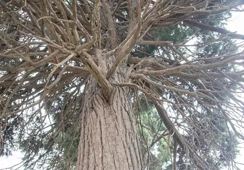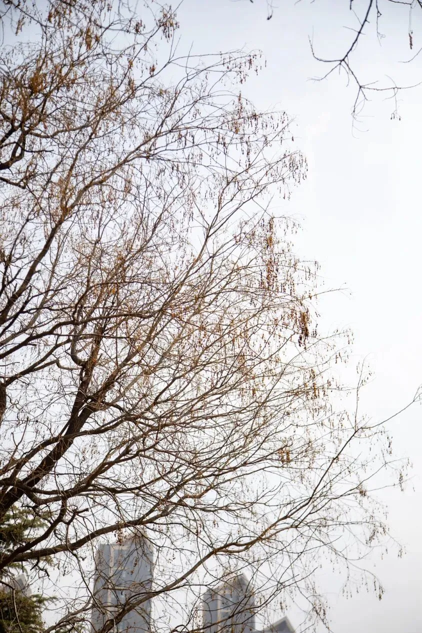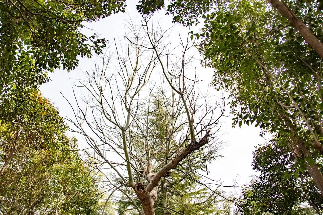 等我们走到它近前,才发现这棵古树蕴藏着旺盛的生命力。灰白的树干之上,一簇簇青色的树枝支棱着向上生长,在这片绿化带里拓展出属于自己的小天地。