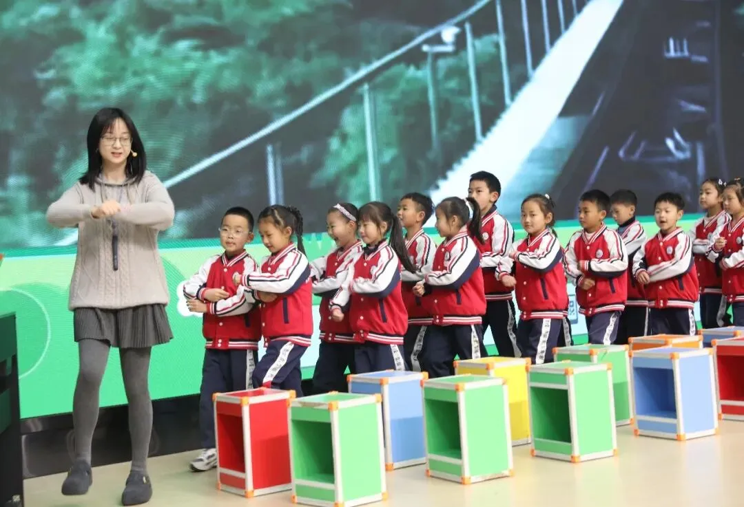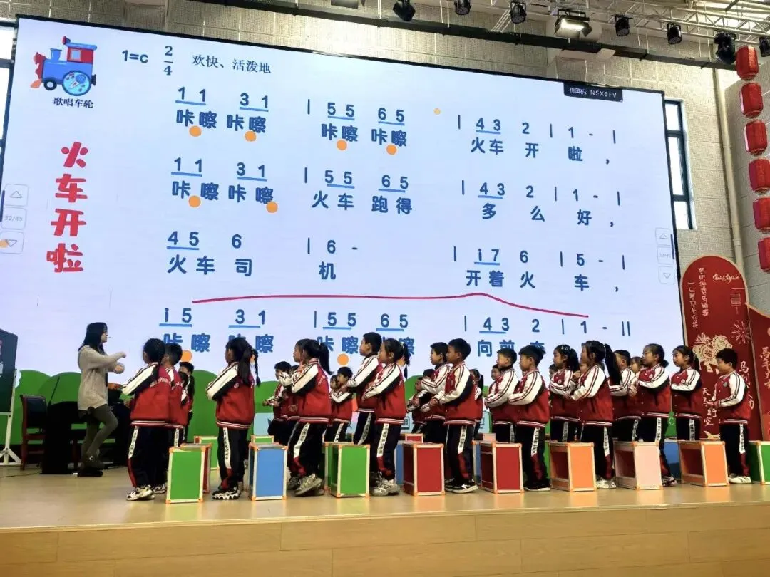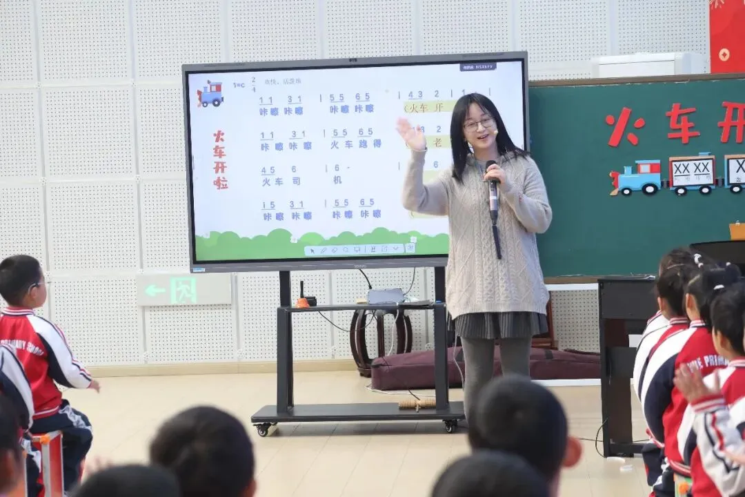 第一节课由小越街道中心小学的张史静老师执教。课堂伊始,张老师通过方言童谣游戏唤醒学生兴趣,引导学生模仿火车鸣笛、车轮滚动的声音,在节奏模仿与多声部合作中,感受2/4拍节奏韵律。