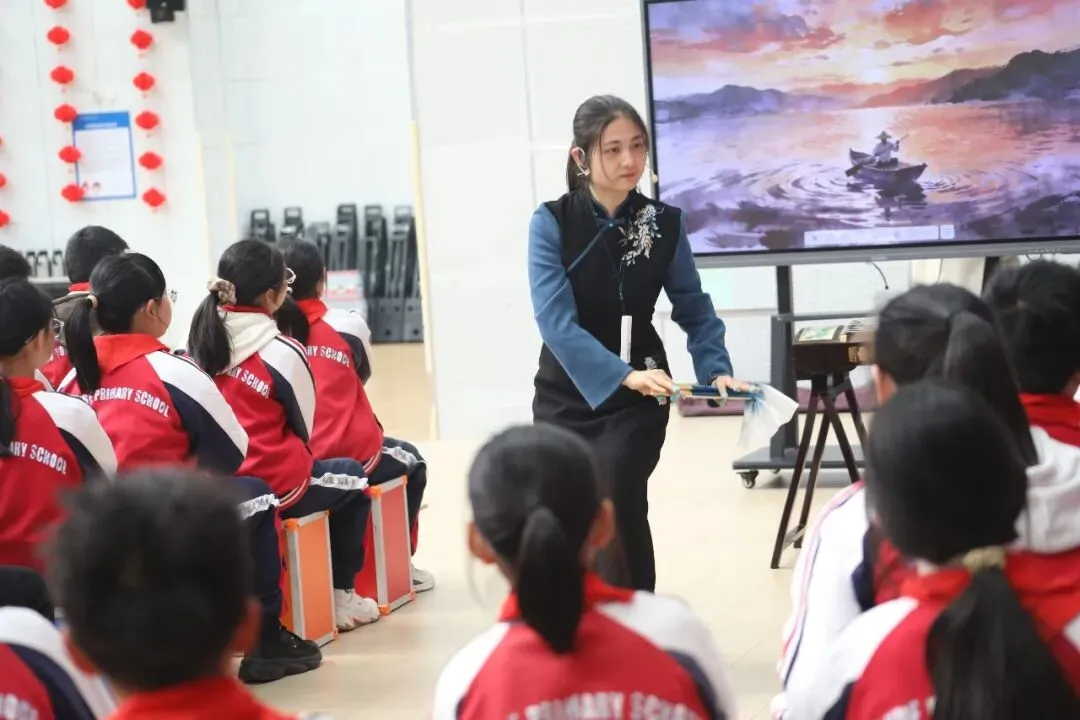 第二节课是由崧厦街道中心小学的方青老师执教的《渔舟唱晚》,方老师以“泛舟湖上”情境导入,通过沉浸式聆听引导学生认识古筝结构与千年历史,结合诗词解读曲名由来,让学生快速走进乐曲诗意。分段探艺环节紧扣乐曲“静—动—静”结构,第一乐段学生轻声模唱、模拟滑音等技法,感受平湖泛舟的悠然;第二乐段对比聆听、模仿花指动作,以掌声模拟水花、折扇律动展现百舟竞归的热闹。