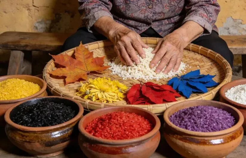 三月三的序曲,早在节前几天就已奏响。奶奶会早早挎上竹篮,走进后山的林间与田埂,仔细采撷染饭的草木:深绿的枫叶、明黄的黄饭花、艳红的红蓝叶,还有带着淡紫气息的紫蓝草。回到家后,她将这些草木洗净、熬煮,滤出清亮的汁液,再把雪白的糯米分别泡进各色汤汁里。经过一夜的浸润,糯米慢慢晕染成明黄、墨黑、绯红、深紫与素白五种鲜亮的颜色,像把春日的山川草木都揉进了米里。蒸饭时,木甑里飘出的草木香混着米香,漫满整个屋子;揭开甑盖的瞬间,五色米粒晶莹饱满,软糯香甜的气息直钻鼻腔,光是看着就让人忍不住咽口水。这碗五彩糯米饭,不仅是舌尖的美味,更承载着壮族人民对五谷丰登的祈愿,象征着生活如五色米粒般斑斓多彩。