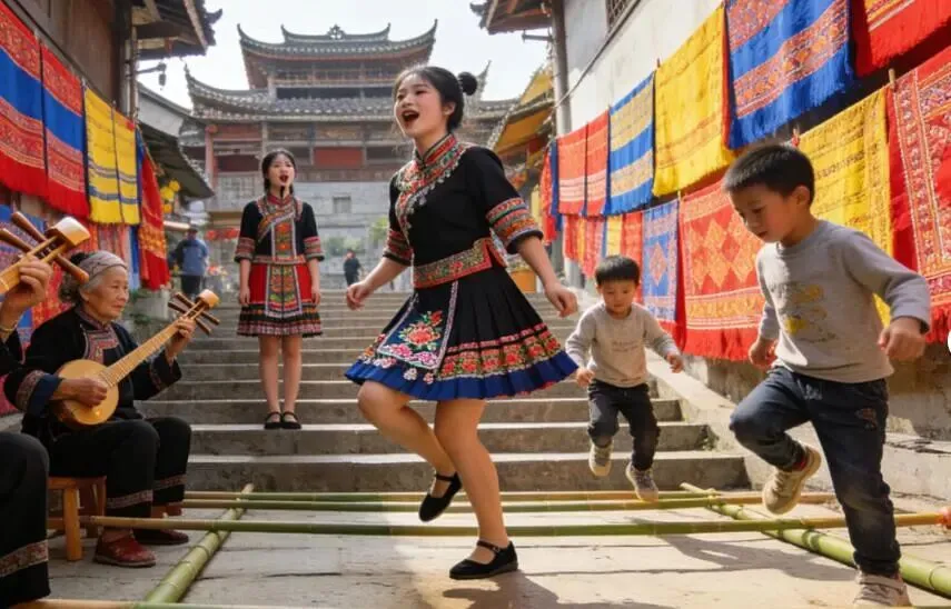 节日当天,整座城都换上了盛装。街头巷尾挂满了绣着花鸟纹样的壮锦,红的热烈、蓝的沉静,在风里轻轻摇曳,像流动的民族画卷。空气中处处回荡着 “嘿撩撩啰” 的山歌声,此起彼伏,连绵不绝,仿佛整座城市都坠入了欢乐的歌海。白发苍苍的阿婆们坐在榕树下,指尖轻拨天琴,悠扬的琴声顺着青石板路飘向远方,和着山歌的调子,成了节日最温柔的背景音;穿着靛蓝百褶裙、戴着银头饰的壮族姑娘们,三五成群站在歌台上,清亮的歌声里藏着山水的灵秀,一句句唱着家乡的风物、心中的情愫。我们这些孩子最爱挤在竹杆舞的队伍里,听着 “啪、啪” 的竹杆敲击声,踮着脚尖在开合的竹杆间跳跃,哪怕偶尔被夹到脚尖,也笑着蹦开,脸上满是无忧无虑的欢喜。