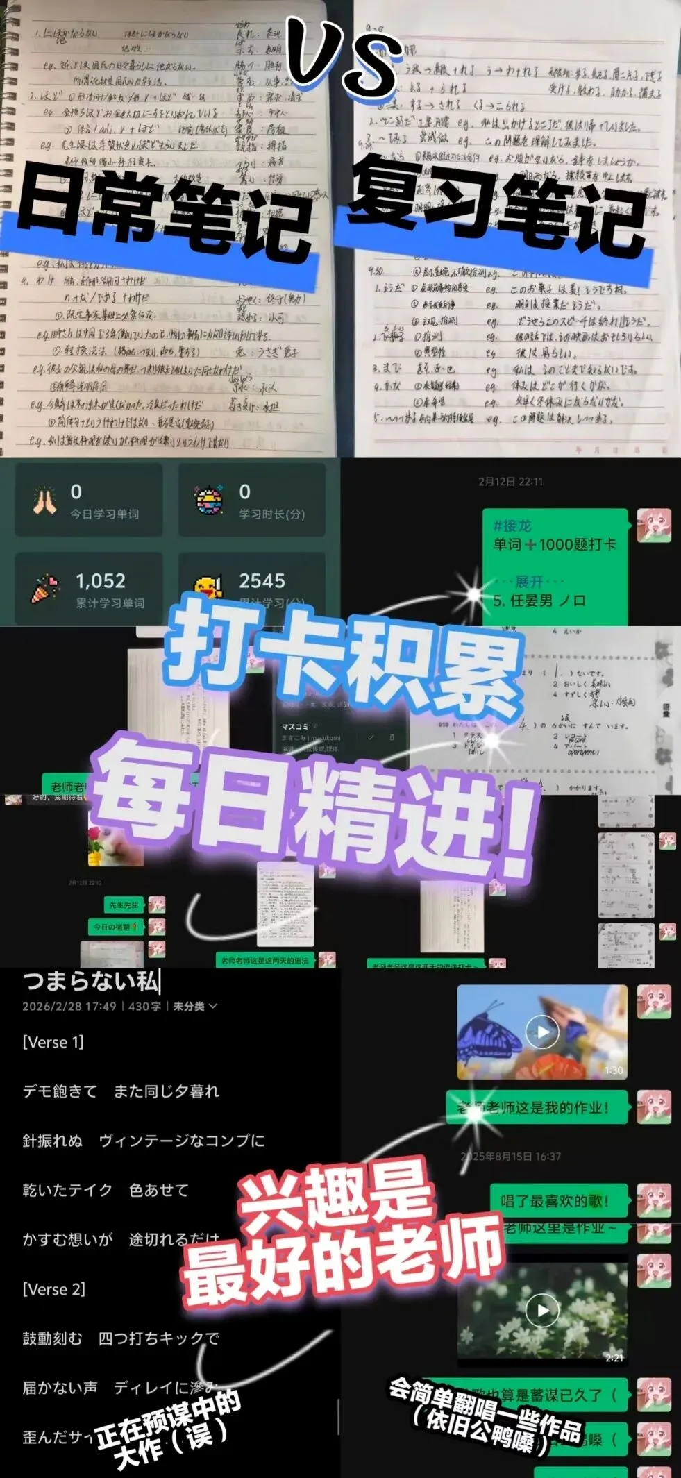 我的学习方法可能不如别人那样精巧高效,算是比较“务实派”的那一类。积累方面,我通过两本笔记来系统整理学习内容,第一本笔记就用于日常积累,上课、做题时随手记录,主要目的是为了将尽可能全面详尽的知识点进行记录。单词方面,老生常谈的单词背诵打卡在我看来依旧是最有效的办法之一,等车、排队、睡前这些零碎时间,都会顺手打开APP刷几个,每天攒一点,不知不觉就记住了不少。备考方面,第二本笔记就派上用场了——我会把重点、易错点浓缩整理,方便考前高效复习。复习语法的时候,我会用范范老师教的方法——每个语法点都自己试着造个句子,写下来,印象就深多了。平时,我还会通过多种方式培养语感:听喜欢的日语歌、看动漫,也会适当看看日本的新闻或综艺节目。这些娱乐活动其实在潜移默化中提升着我对日语的熟悉度,也让学习过程更自然有趣。