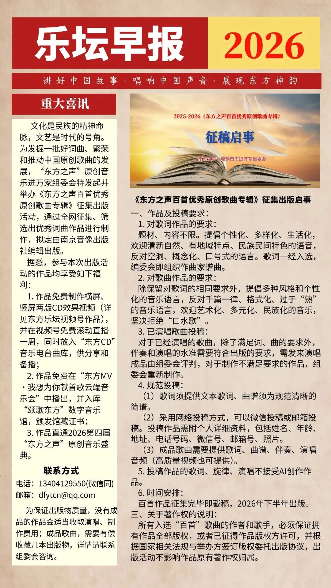 2025-2026《东方之声百首优秀原创歌曲专辑》征集出版启事