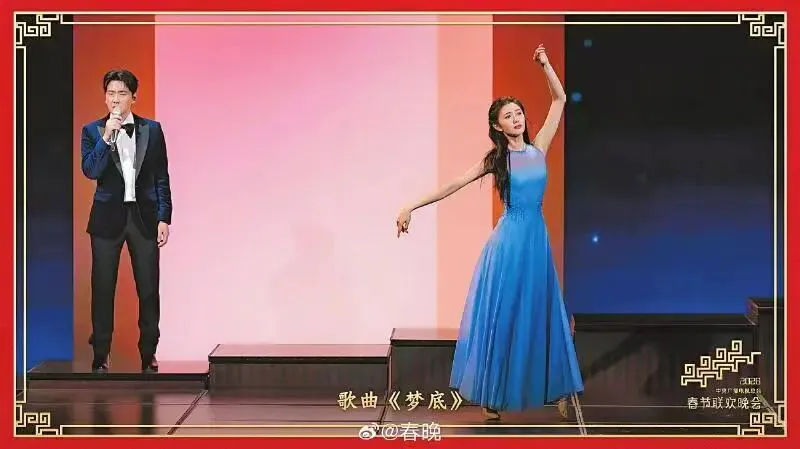 《梦底》以深情的歌词打动人心,“何其有幸你出现梦里/何其不幸你只在梦里”拉近了听众的情感共鸣。这首歌动情之处在于以梦境的形式表达思念,其传递的温柔足以支撑听众度过漫长与荒凉的时光。海来阿木、刘浩存在央视春晚表演该曲时,舞台设计巧妙运用分隔时空的光门,填满观众视觉空间。光门在冷暖色调间浮动,如梦境与现实的冲突交织,人物在门前出现又抽离,象征梦境的虚无。而当旋律唱到“我们或许不会再相遇/人来人往四季中老去”时,时空之门缓缓隐去,数字分身如烟消散,梦境回归现实,留下绵长而深沉的思念。