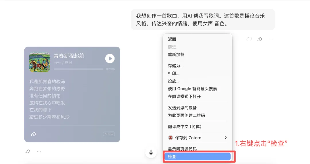 1.在与豆包对话的窗口中右键点击“检查”。
