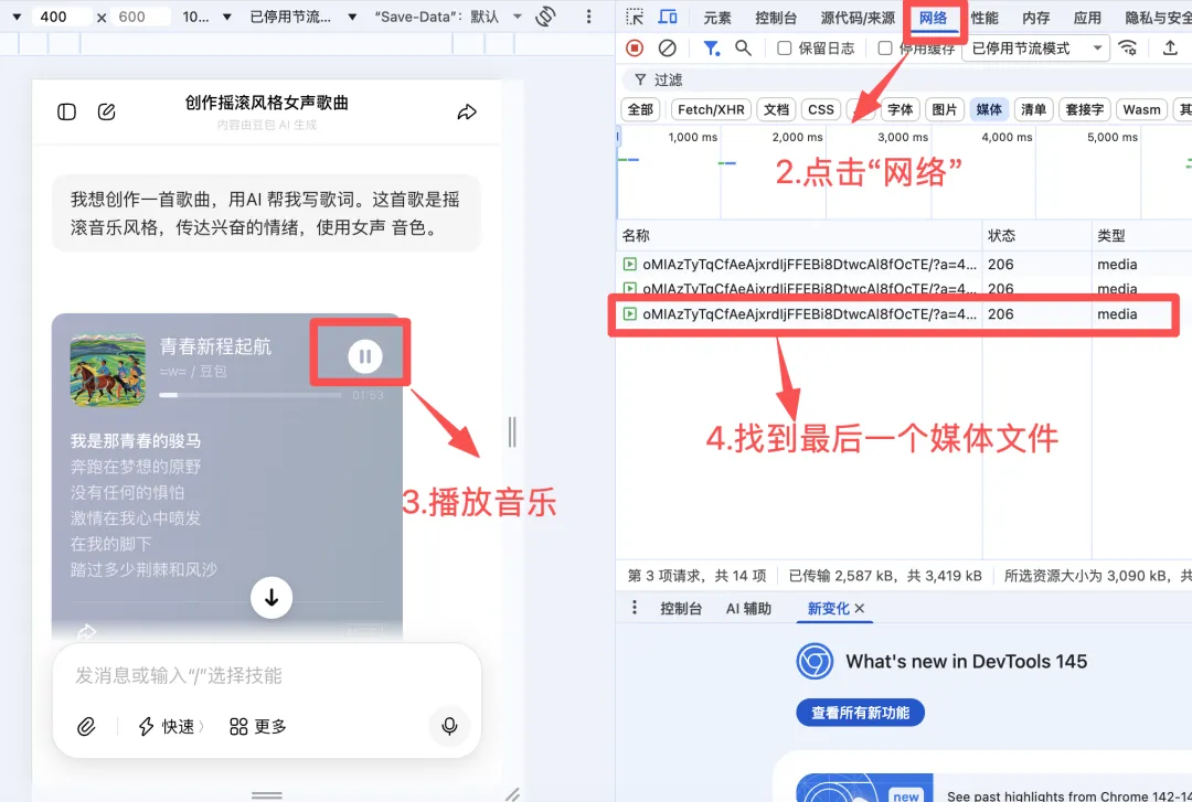 豆包生成的歌曲在对话框里只能转发,不能下载。于是我找了一下下载方法,有需要的小伙伴可以查看下面的操作教程。
