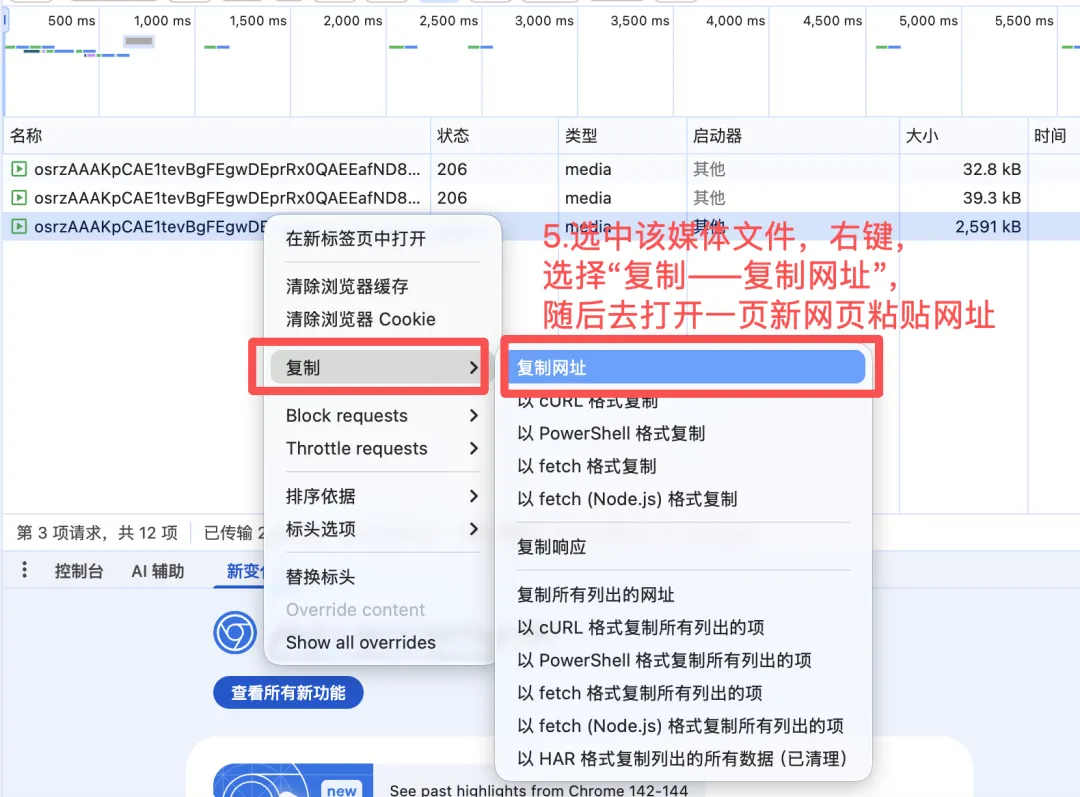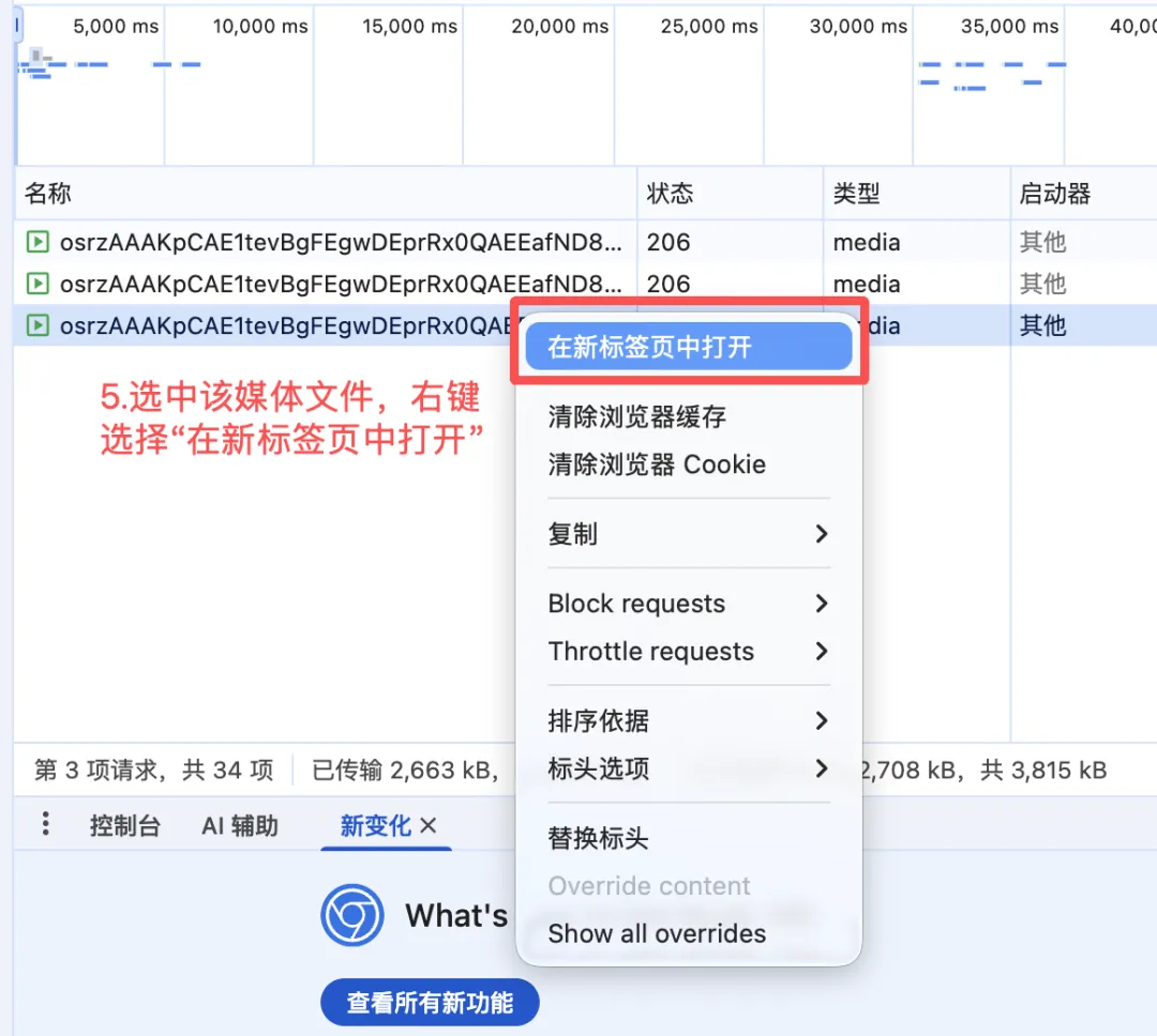 3.选中最后一个媒体文件,右键,此时可以选择“复制——复制网址”,打开新网页粘贴网址,也可以直接选择“在新标签页中打开”。