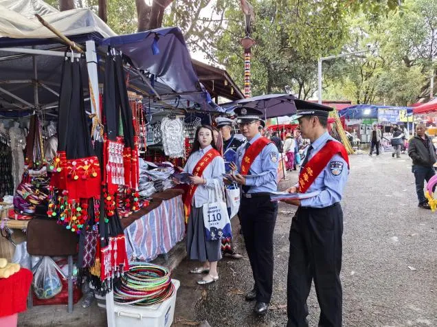 此外,宣传民警还深入周边商贩集中区域开展流动宣传。他们手持禁毒宣传手牌,发放禁毒宣传手册,跟随着目瑙纵歌的舞步穿梭在群众中,用汉语、景颇语双语讲解防毒技巧,引导群众树立健康的生活理念,积极营造安全、文明、和谐的节日氛围。