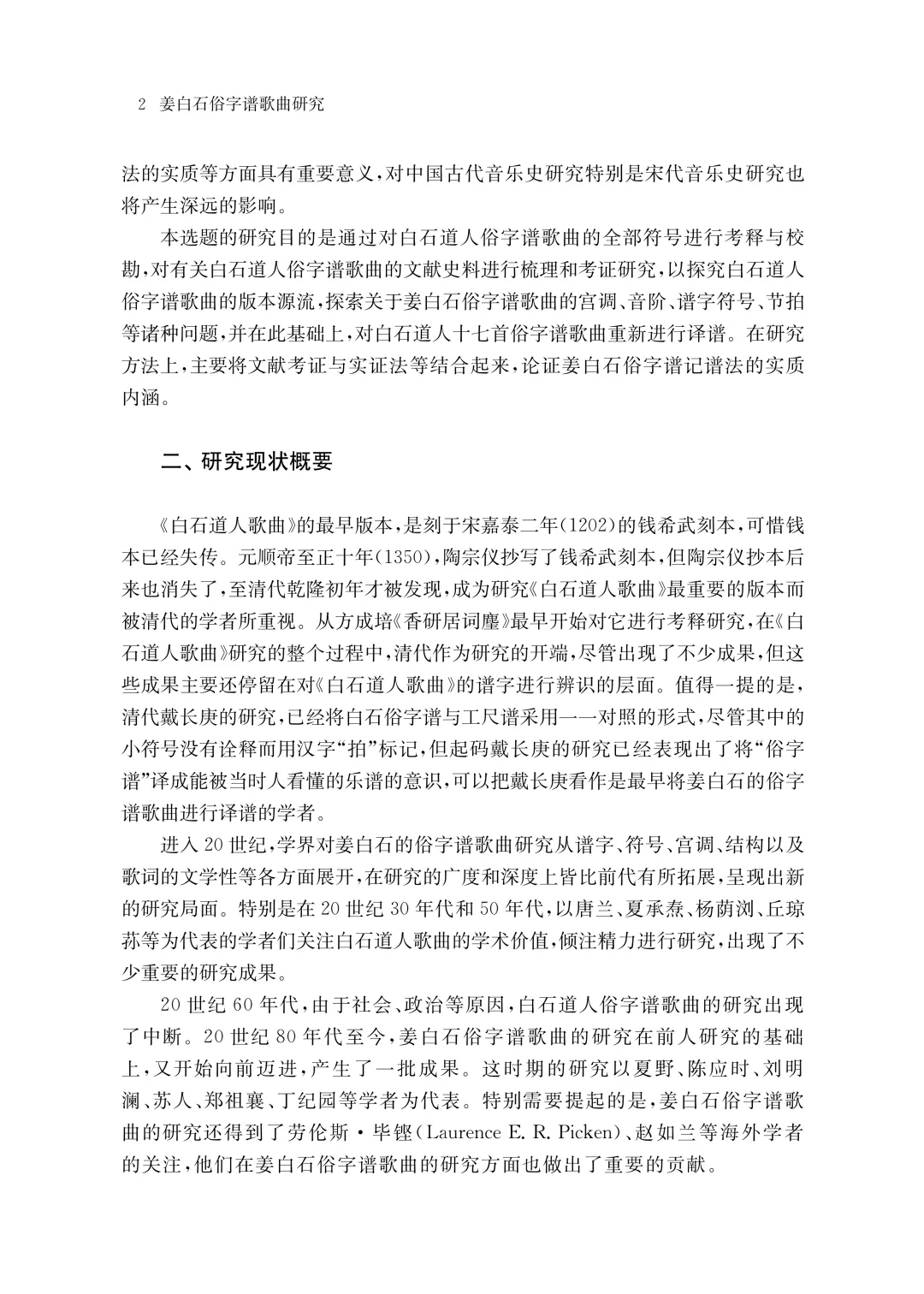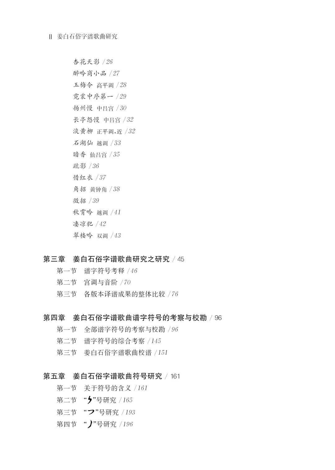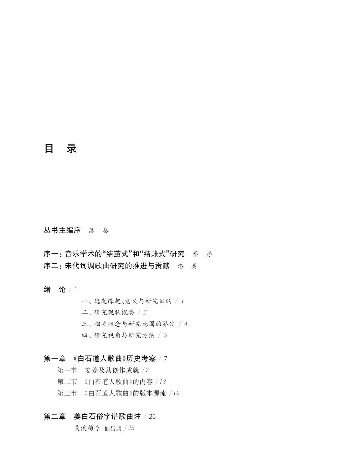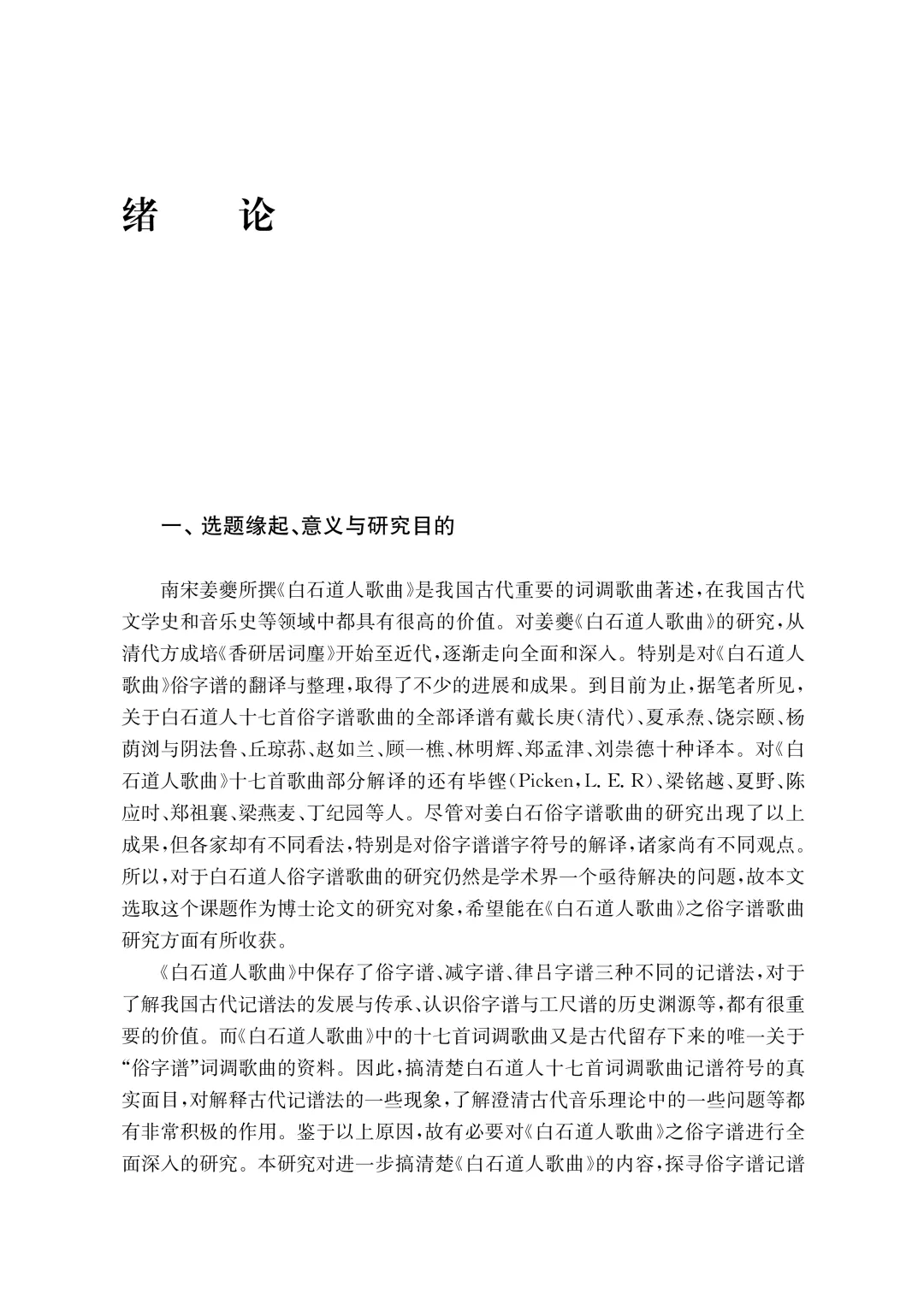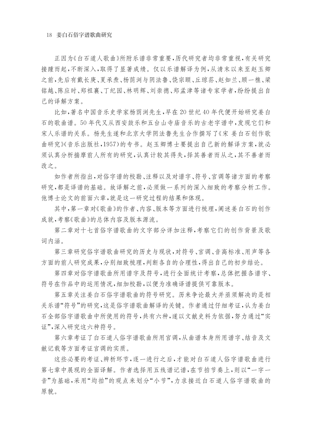 《姜白石俗字谱歌曲研究》是上海音乐学院“宋代音乐文化阐释与研究文丛”系列丛书之一。本书包括七章及引言、参考文献、后记,内容涉及姜白石俗字谱歌曲的历史考察,歌曲注释,姜白石俗字谱歌曲的研究现状,谱字符号的考察、校勘,以及符号、宫调、译谱诸方面的研究。每一章重点研究白石道人俗字谱歌曲的一个或几个方面,步步深入,从俗字谱歌曲的“外围”到曲谱本身进行全面的研究,提出了不少新的观点,并最终提出了对姜白石十七首俗字谱歌曲的新的译谱。该著作对于俗字谱的校勘、注释以及对谱字、符号、宫调等诸方面的进一步考察,更新、推进了原有的研究基础,具有重要的意义和价值。[1]