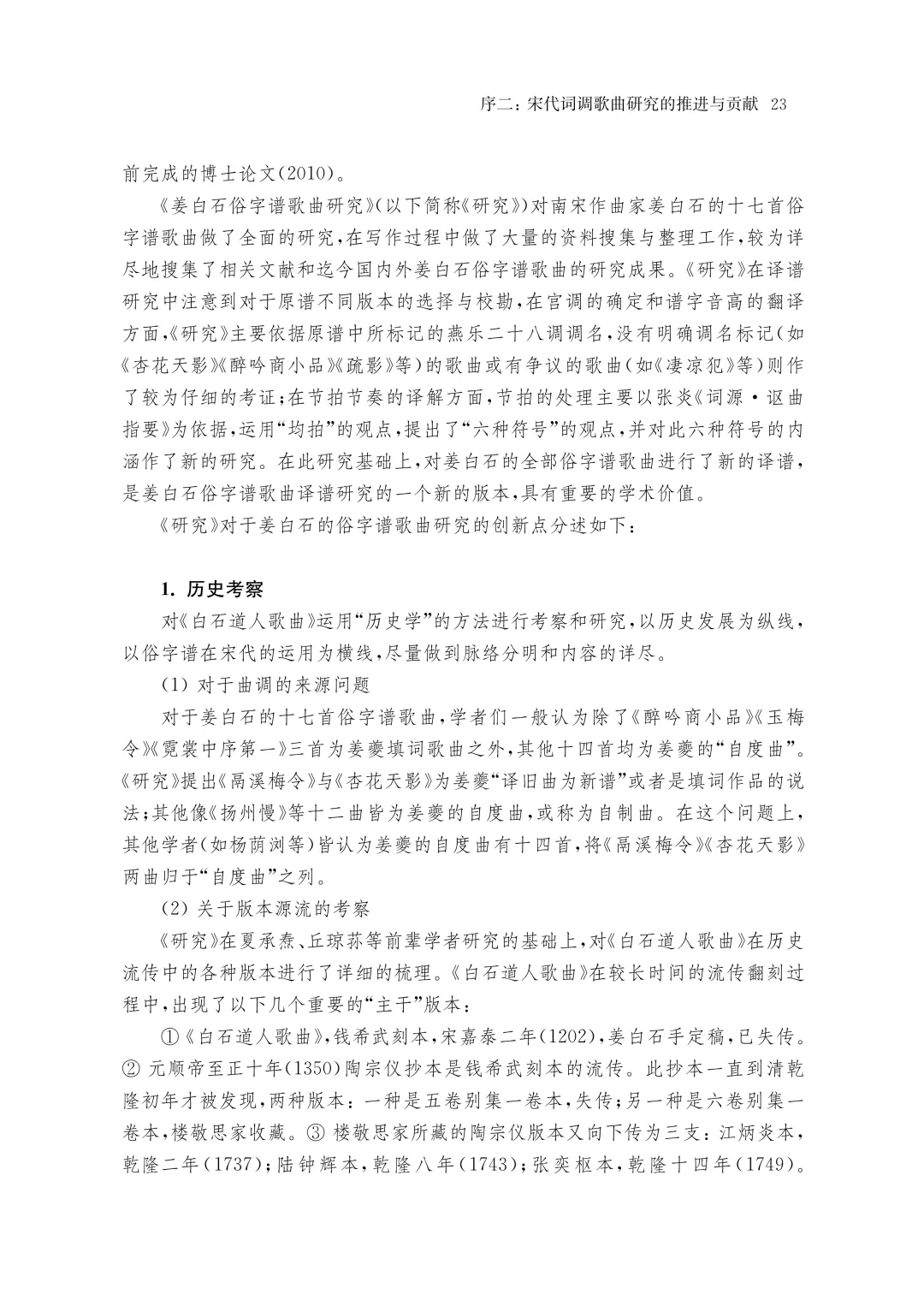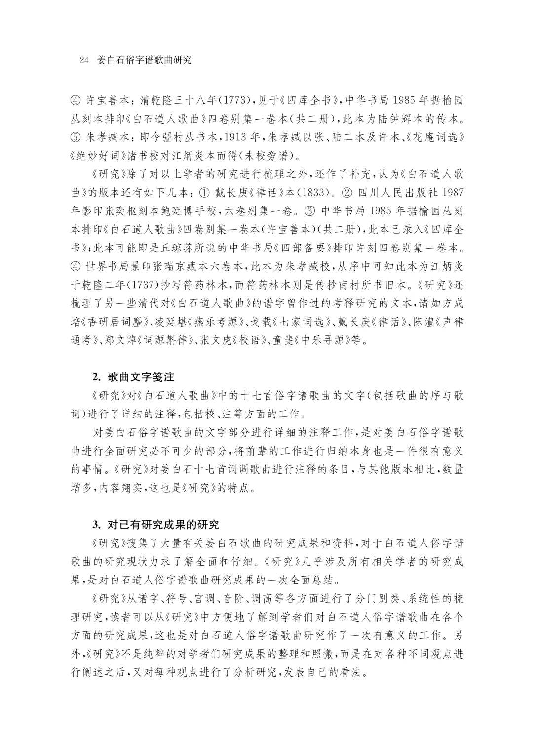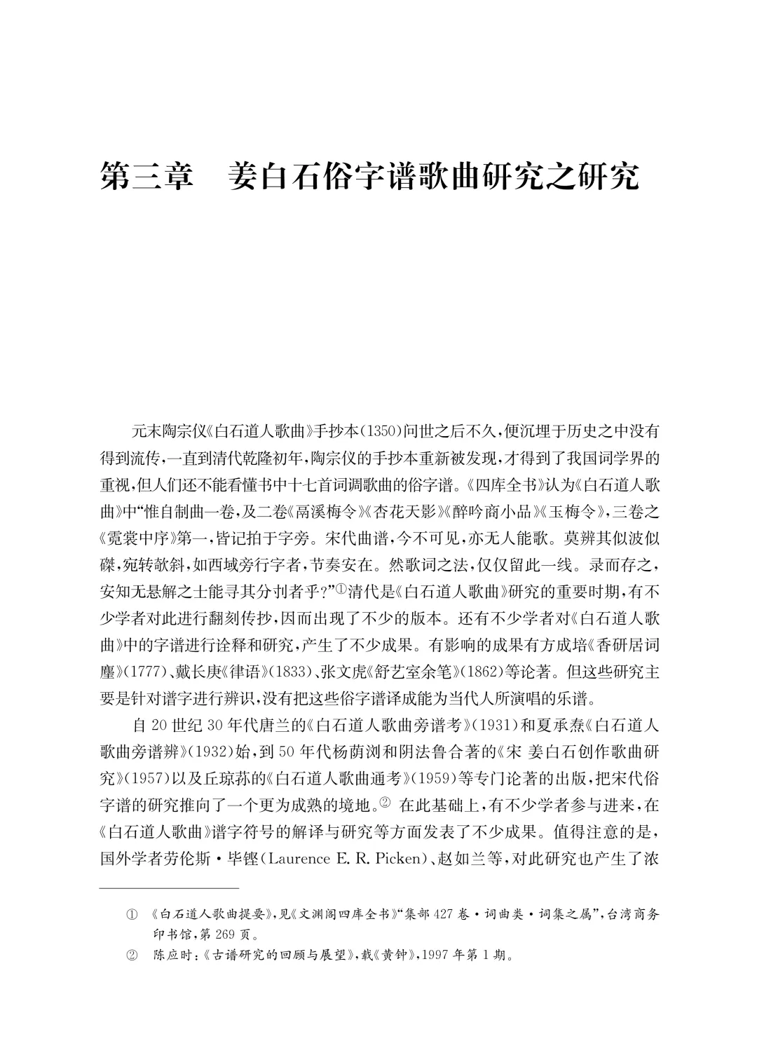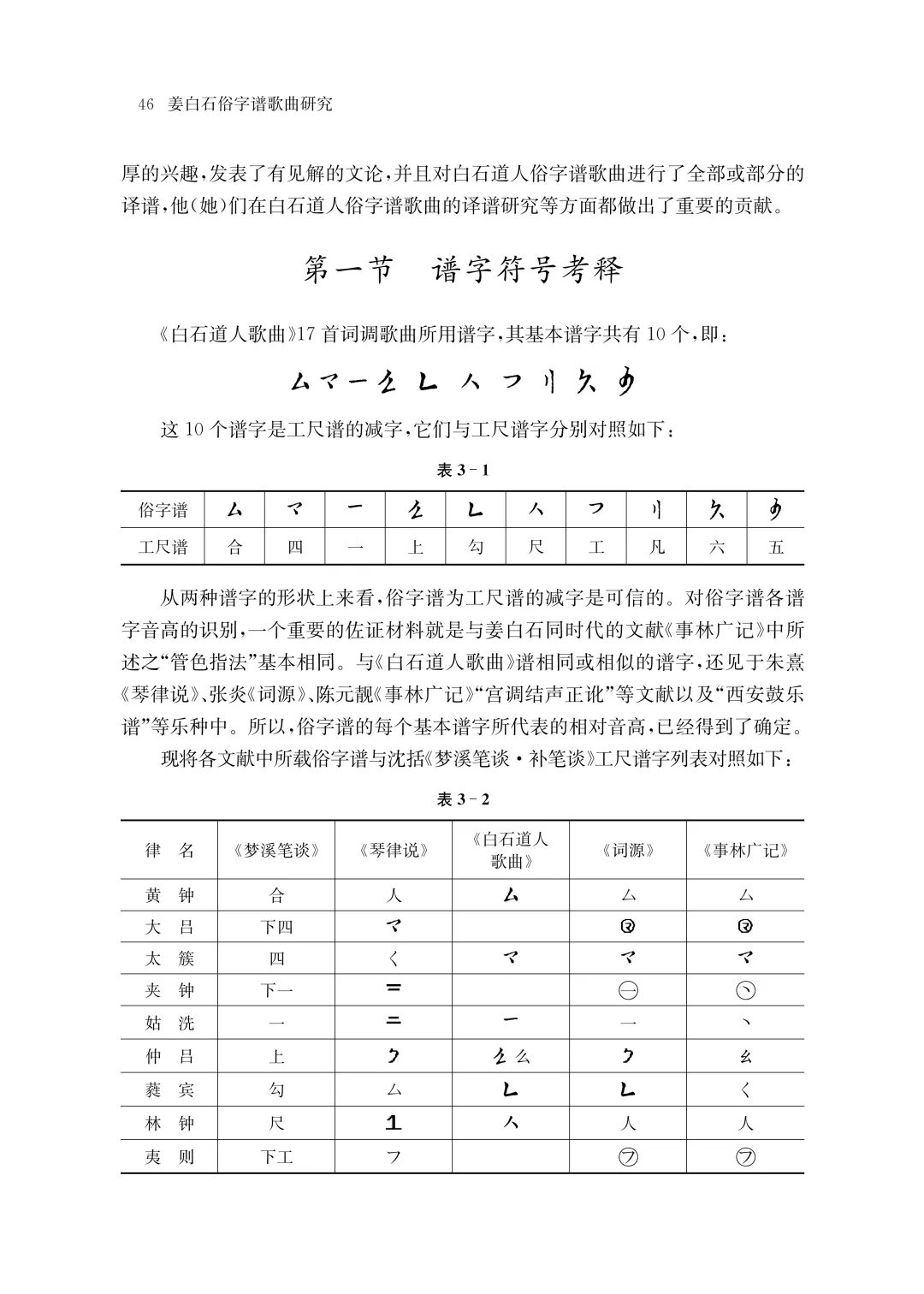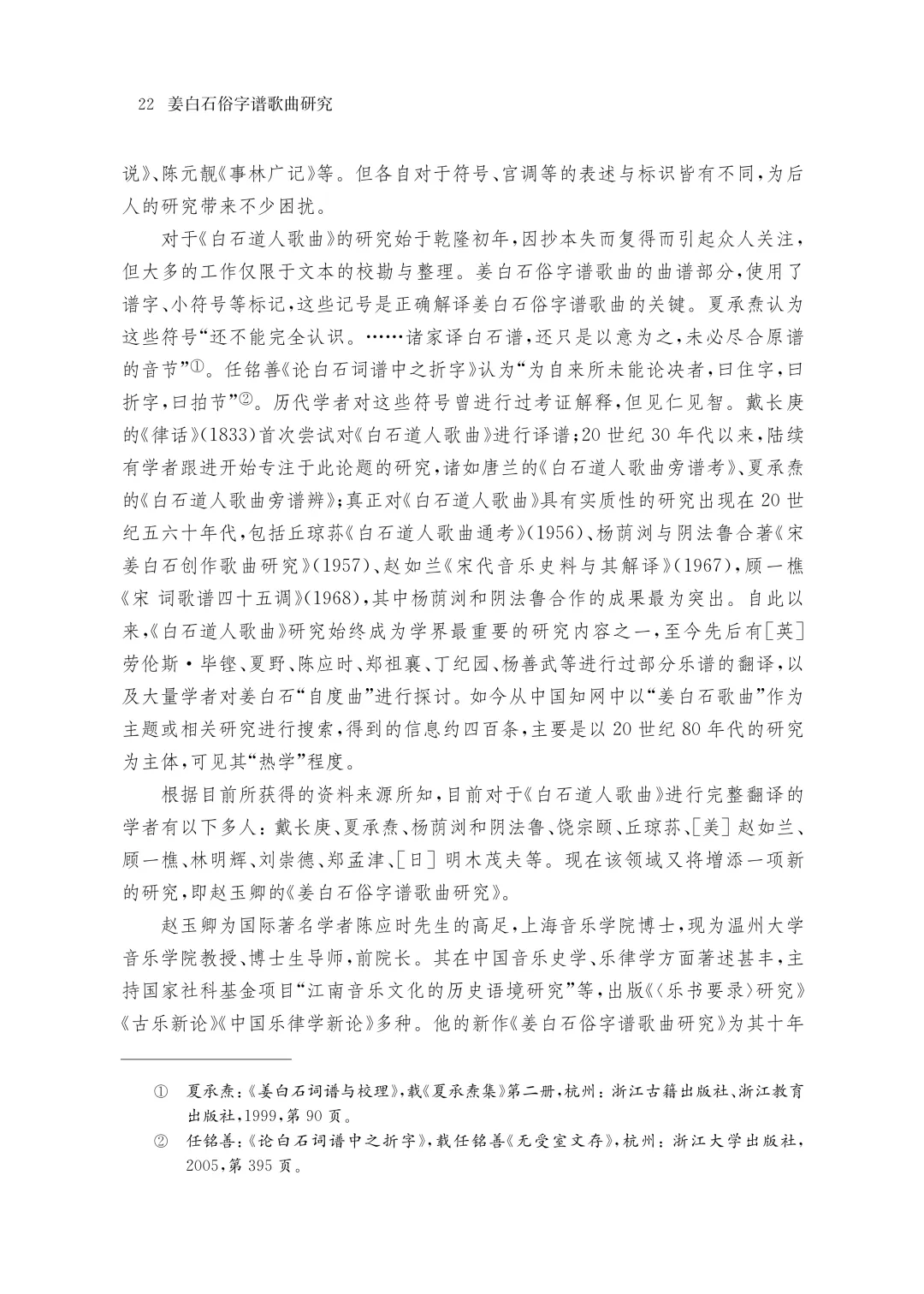 《姜白石俗字谱歌曲研究》是上海音乐学院“宋代音乐文化阐释与研究文丛”系列丛书之一。本书包括七章及引言、参考文献、后记,内容涉及姜白石俗字谱歌曲的历史考察,歌曲注释,姜白石俗字谱歌曲的研究现状,谱字符号的考察、校勘,以及符号、宫调、译谱诸方面的研究。每一章重点研究白石道人俗字谱歌曲的一个或几个方面,步步深入,从俗字谱歌曲的“外围”到曲谱本身进行全面的研究,提出了不少新的观点,并最终提出了对姜白石十七首俗字谱歌曲的新的译谱。该著作对于俗字谱的校勘、注释以及对谱字、符号、宫调等诸方面的进一步考察,更新、推进了原有的研究基础,具有重要的意义和价值。[1]